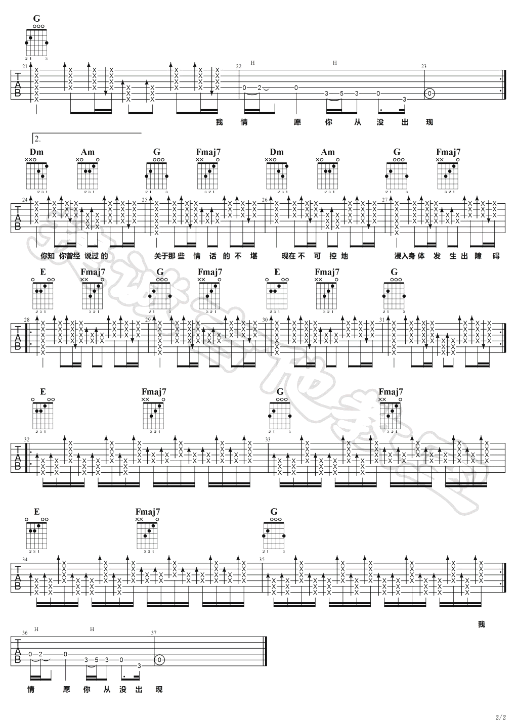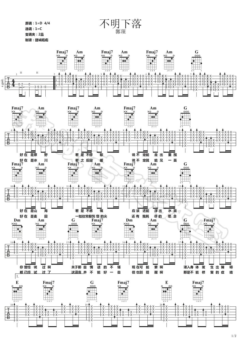 曲谱介绍: 郭顶《不明下落》吉他弹唱谱,采用C调指法编配原版,共有2张高清图谱,免翻页排版设计。