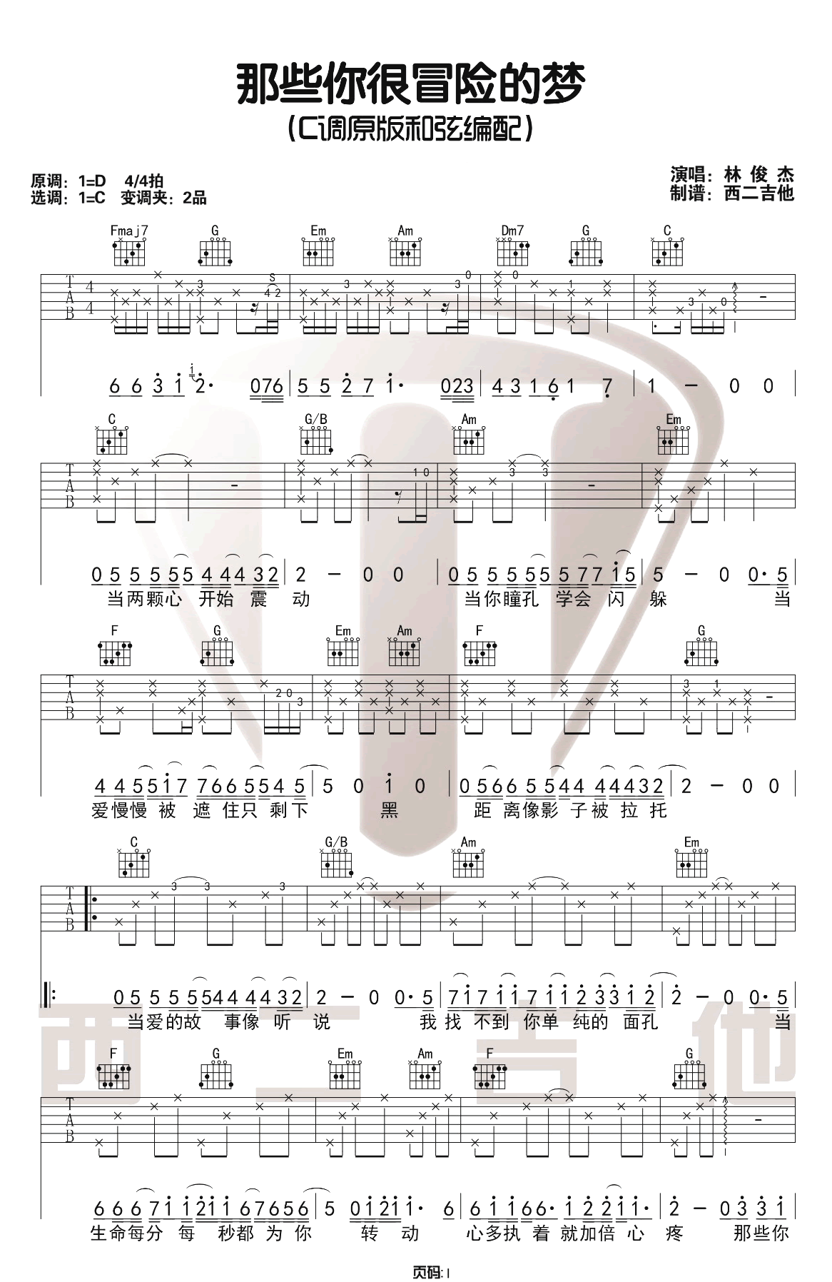 曲谱介绍: 林俊杰《那些你很冒险的梦》吉他弹唱谱,采用C调指法编配原版,共有3张高清图谱。