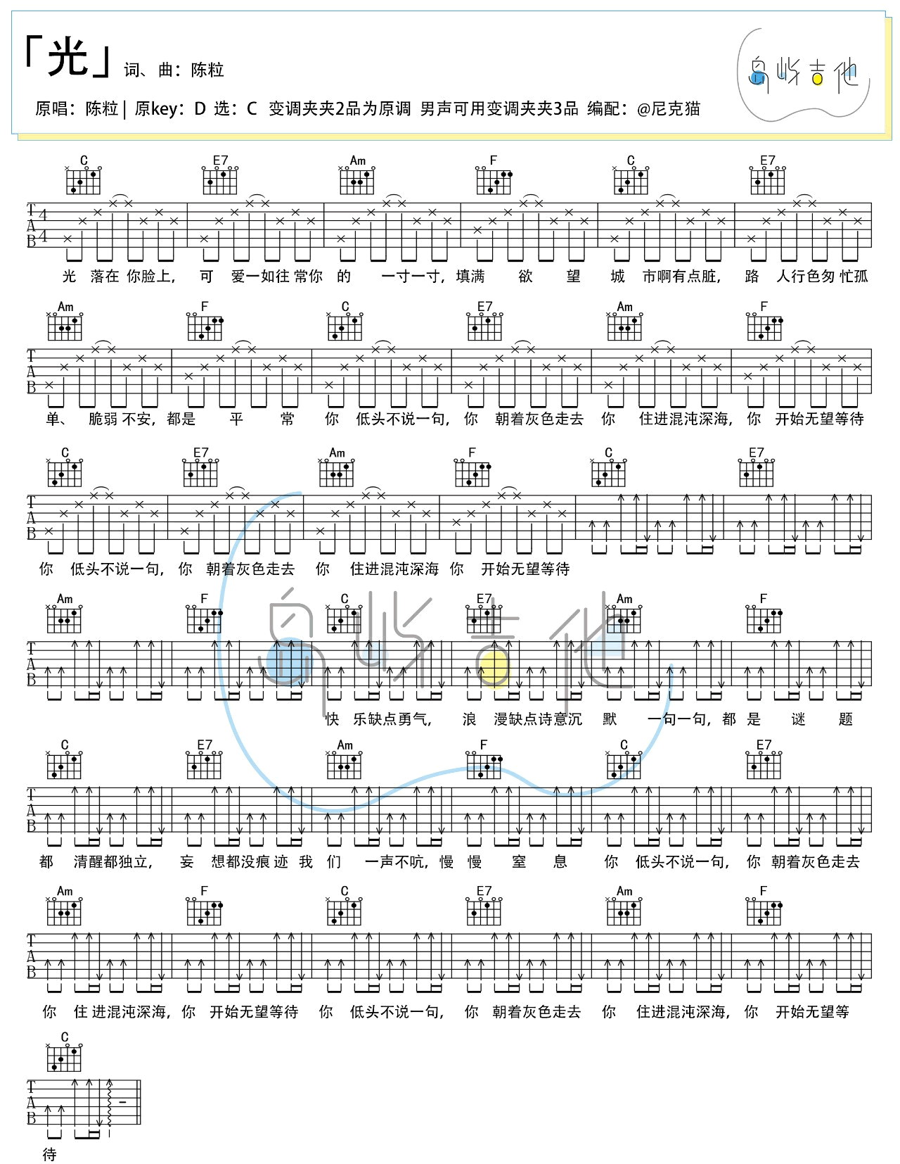 曲谱介绍: 陈粒《光》吉他弹唱谱,采用C调指法编配,共有1张高清图谱,免翻页排版设计。