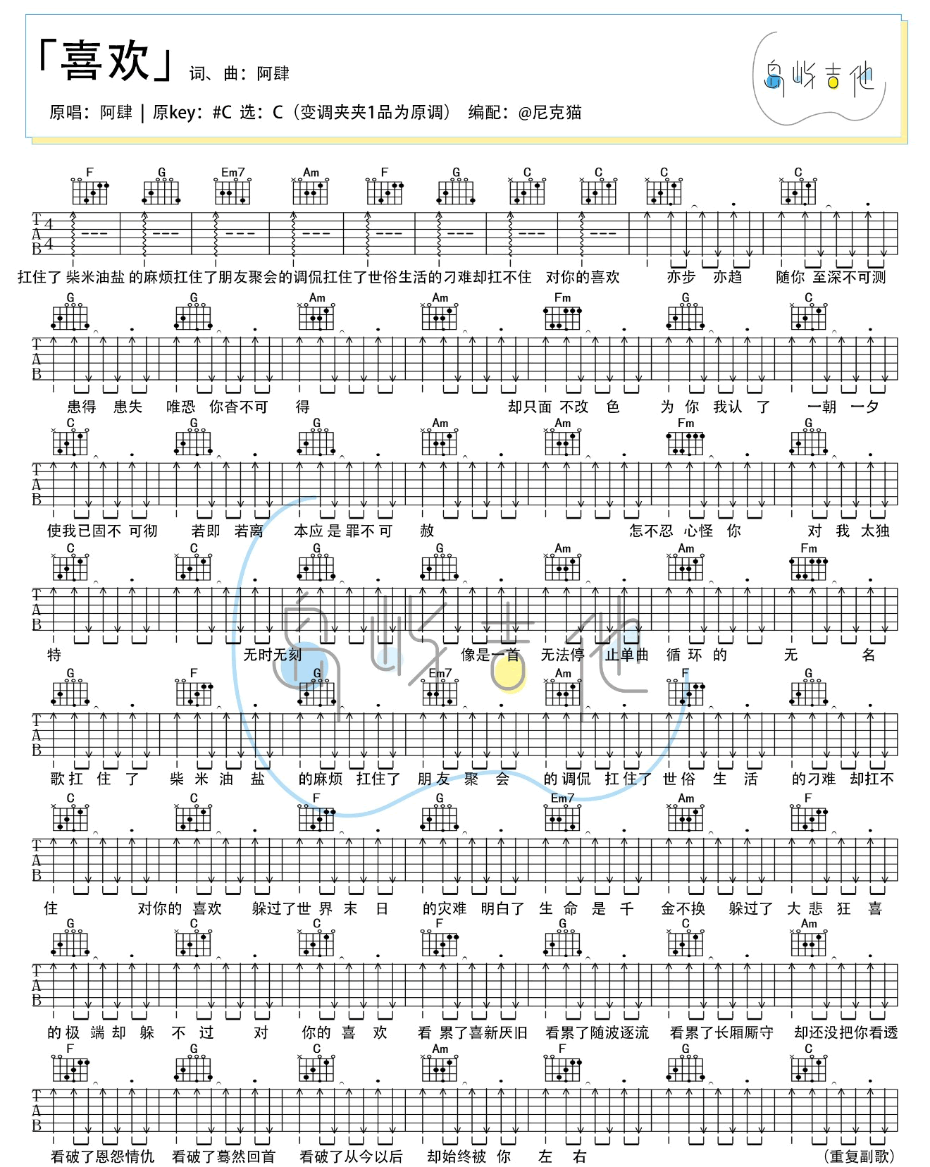 喜欢吉他谱 - 阿肆 - C调吉他弹唱谱