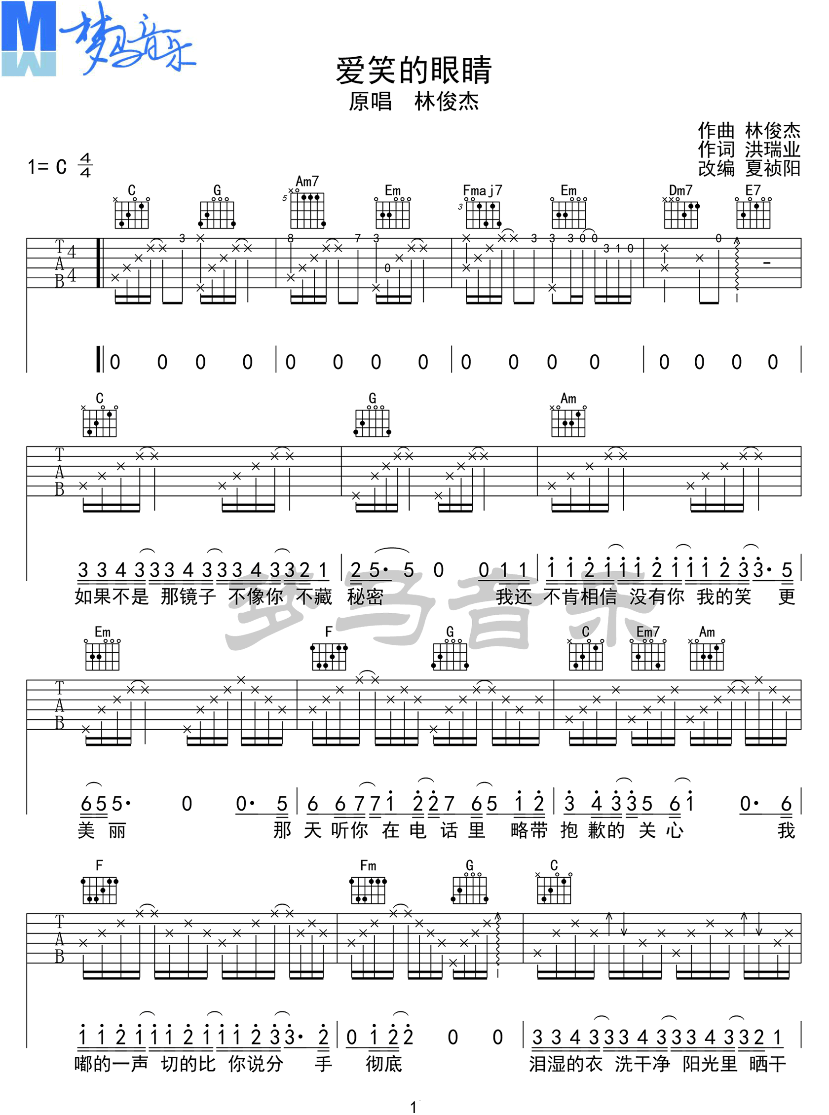 曲谱介绍: 林俊杰《爱笑的眼睛》吉他弹唱谱,采用C调指法编配,共有3张高清图谱。