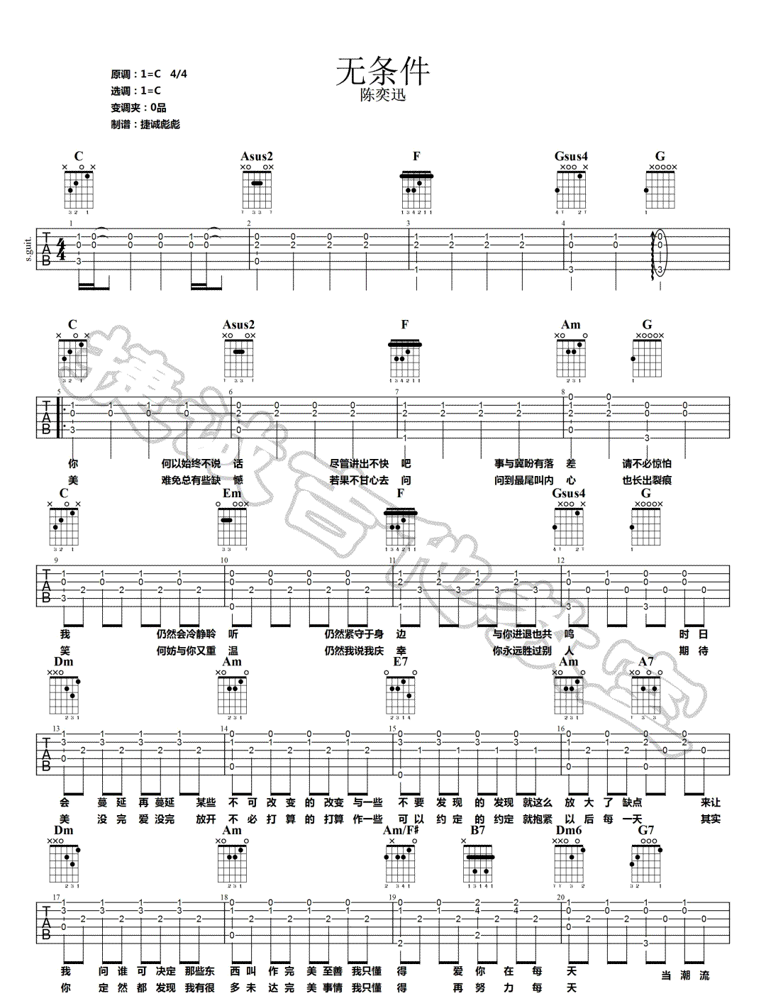 曲谱介绍: 陈奕迅《无条件》吉他弹唱谱,采用C调指法编配原版,共有2张高清图谱,免翻页排版设计。