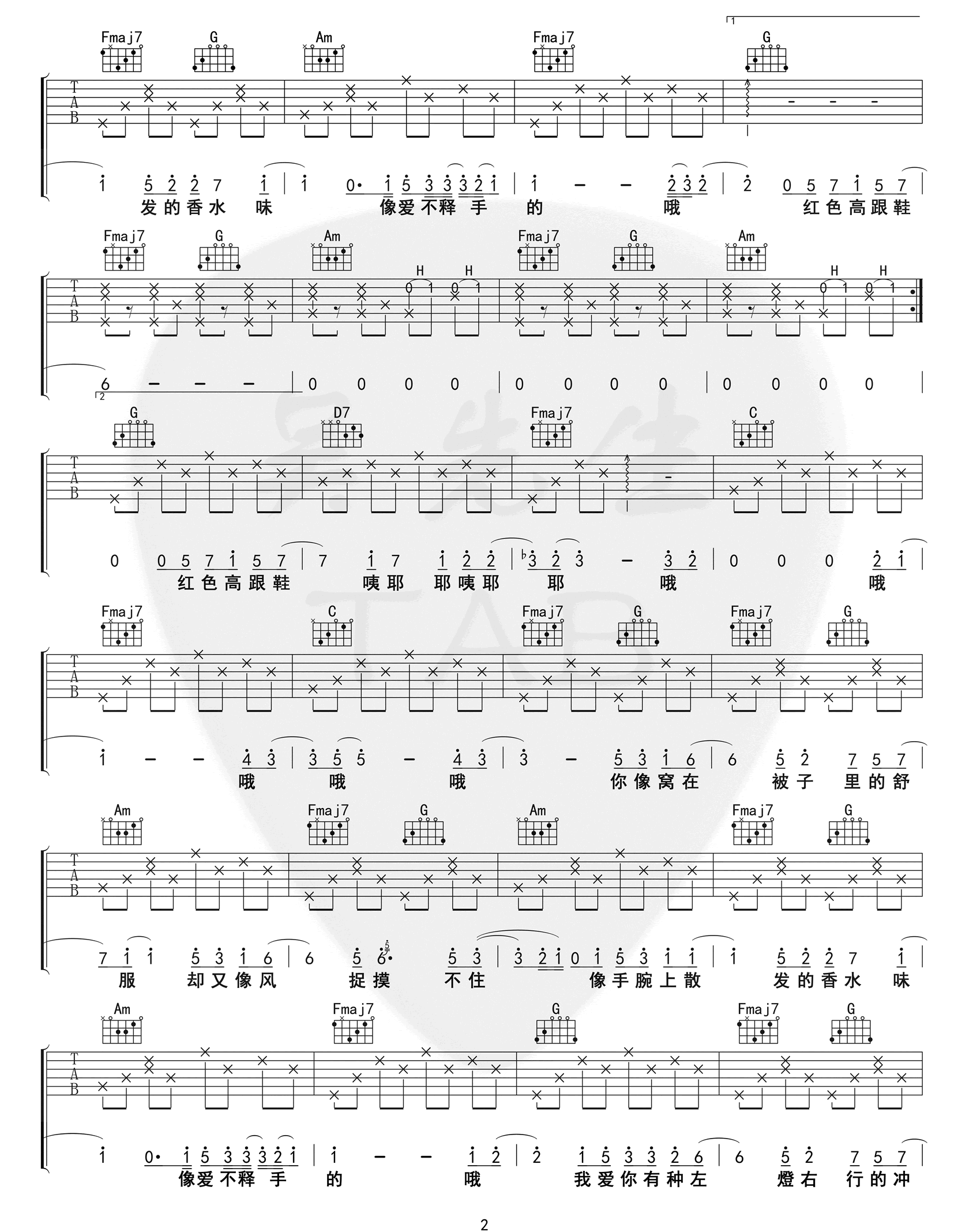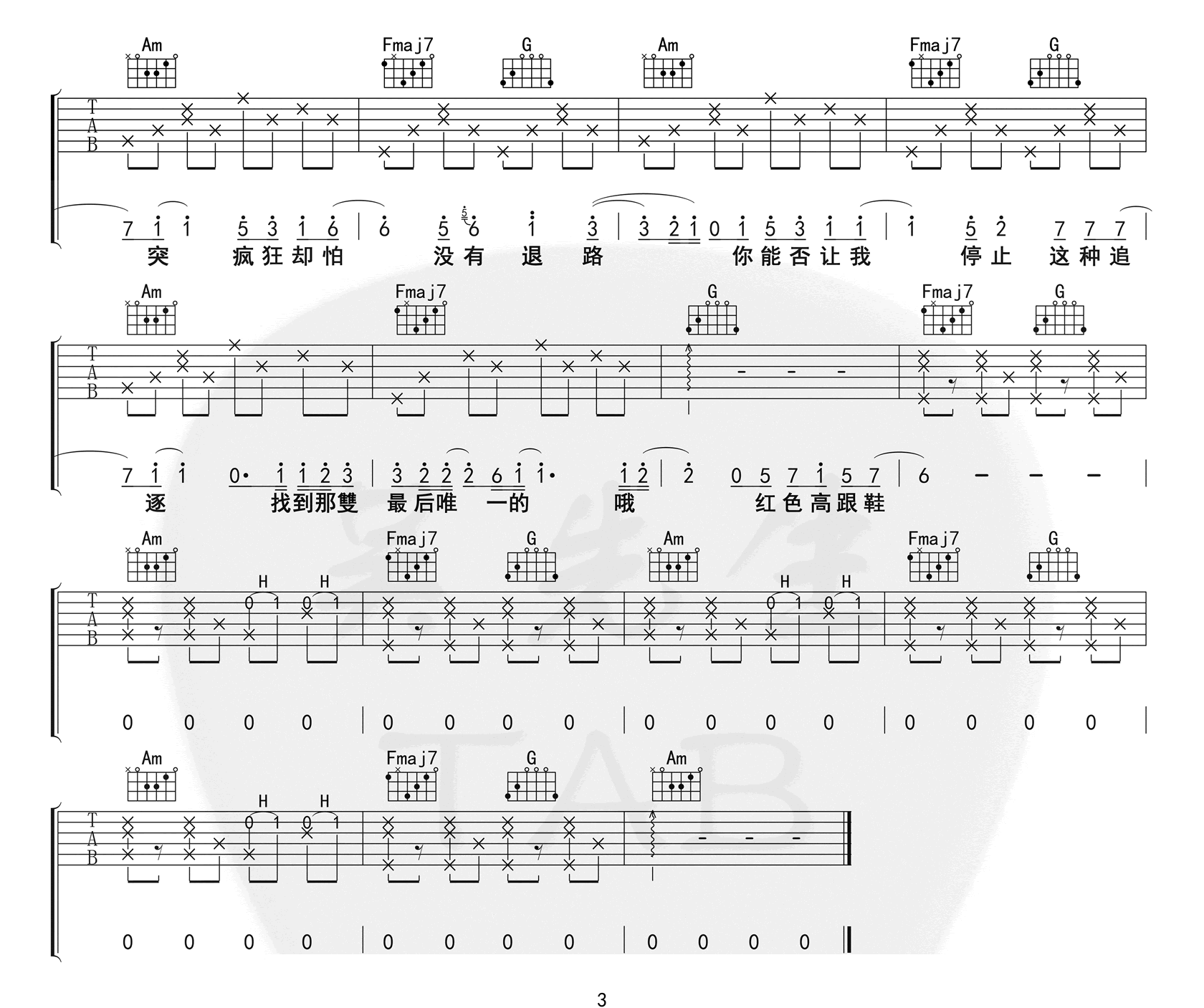 曲谱介绍: 蔡健雅《红色高跟鞋》吉他弹唱谱,采用C调指法编配,共有3张高清图谱。