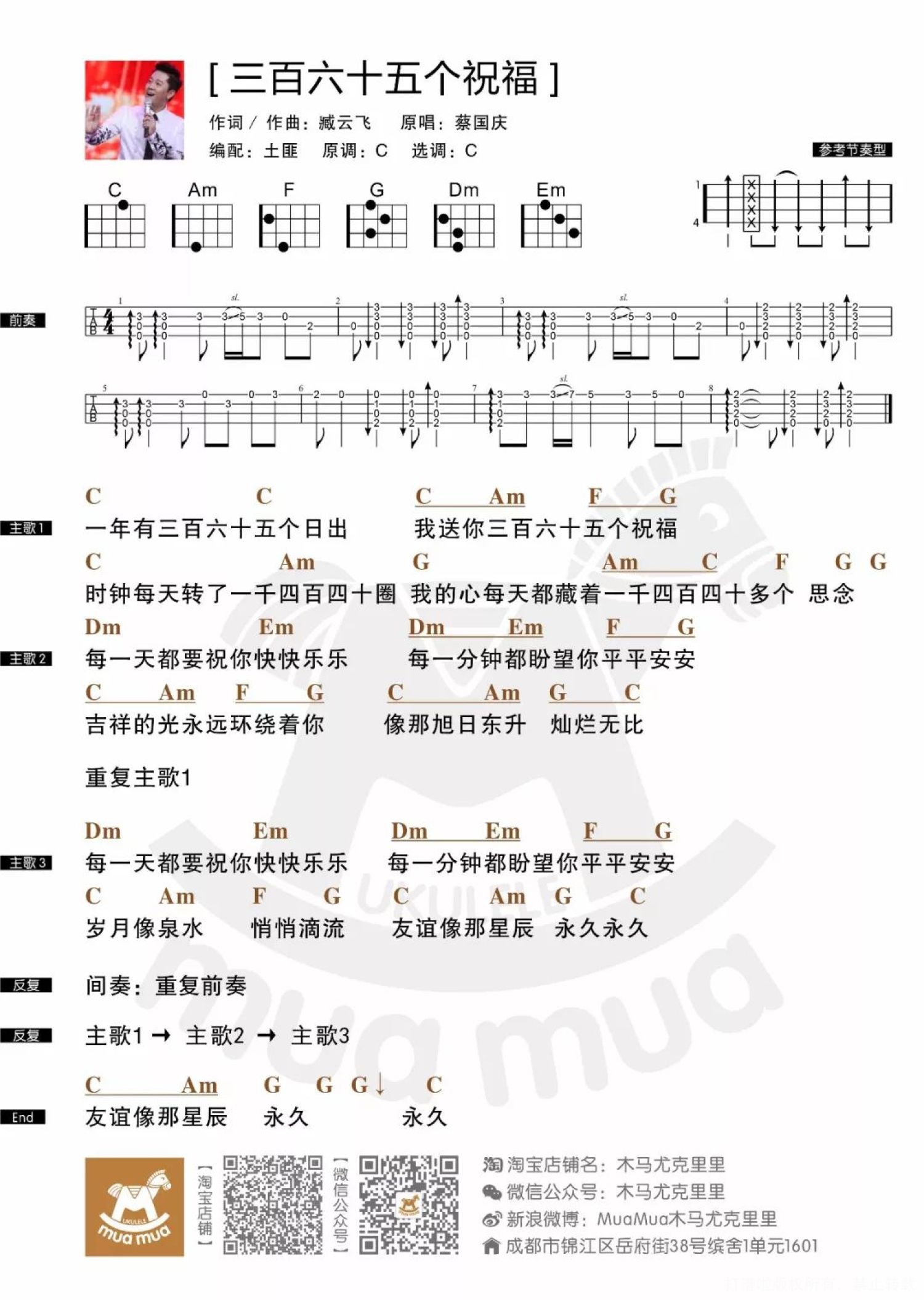 曲谱介绍: 没有错,今天木马为大家带来的是年年播年年放,即使不看也会唱 的知名祝福系歌曲 鼻祖《三百六十五个祝福》。 自从91年春节元宵晚会蔡国庆老师登台第一次演唱这首歌以来,已经过去了将近27个寒暑。这些年每到暑假我们便围坐在电视机面前观看《西游记》和《新白娘子传奇》。 一到寒假家中聚会,我们常常伴着没人看的电视中传出的《三百六十五个祝福》和大人搓麻将的声音,拿着压岁钱冲出家门买鞭炮和零食。 咳咳......值得一提的是,蔡国庆老师是一位看似端庄实则逗比的人,早些时候先是作为主咖参加了吐槽大会任人蹂躏,后又在2017暑期上映的卢正雨电影《绝世高手》中客串了一把最终BOSS大魔王,更在电影中调侃了自己的两首名曲《同一首歌》和《三百六十五个祝福》,天雷滚滚让画里画外的人都无比惊悚。 接下来就为大家送上《三百六十五个祝福》吧! 首先是蔡国庆 刘土匪的演示视频,请轻喷...... 尤克里里演示   尤克里里谱 小贴士:请用浮夸的通俗流行唱法搭配老派舞台手势方可达到最佳视听效果。 最后土匪代表木马驷马 提前祝大家春节愉快 学会这首歌回去吓一吓那些 问东问西的三姑六婆吧 颗颗