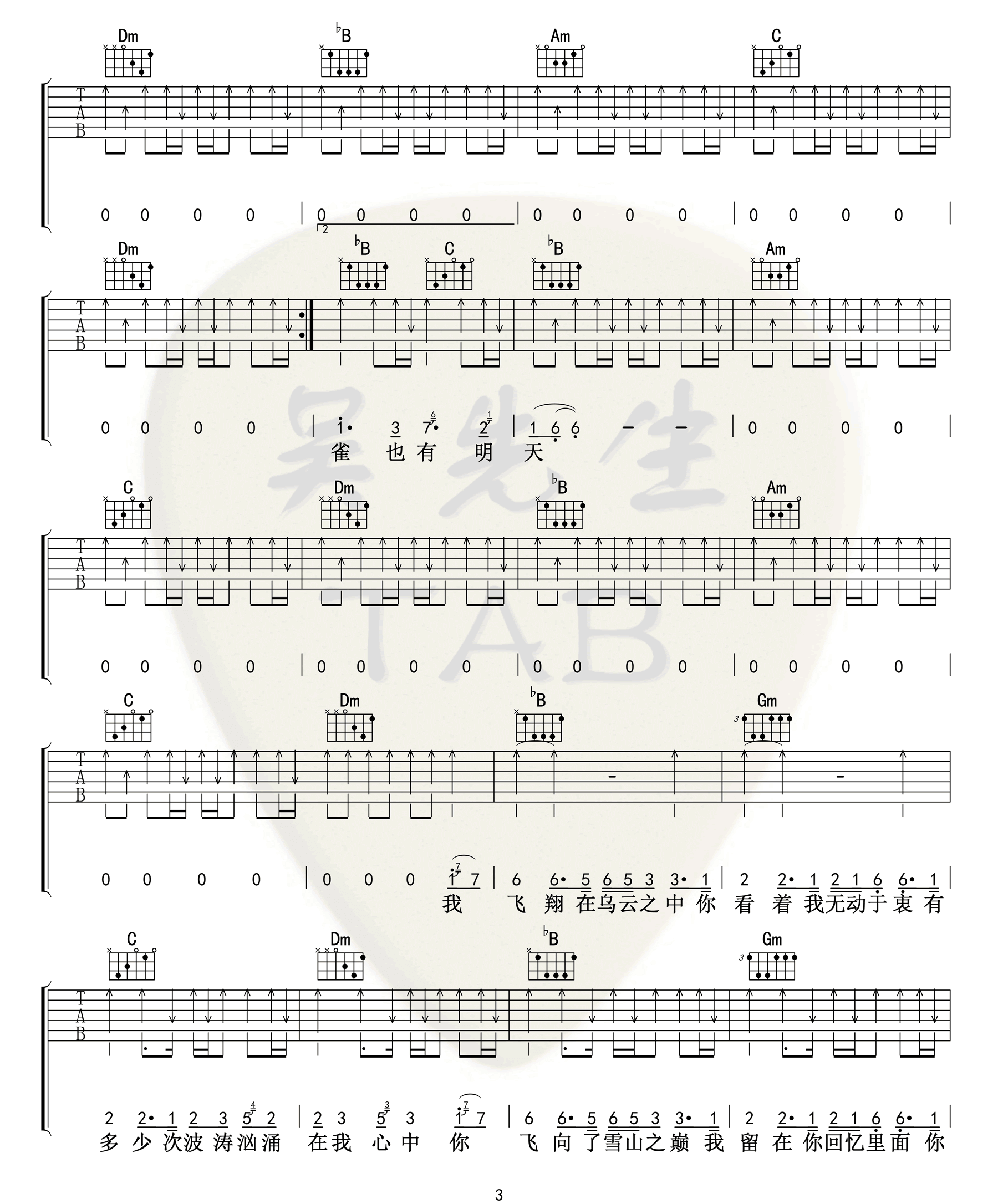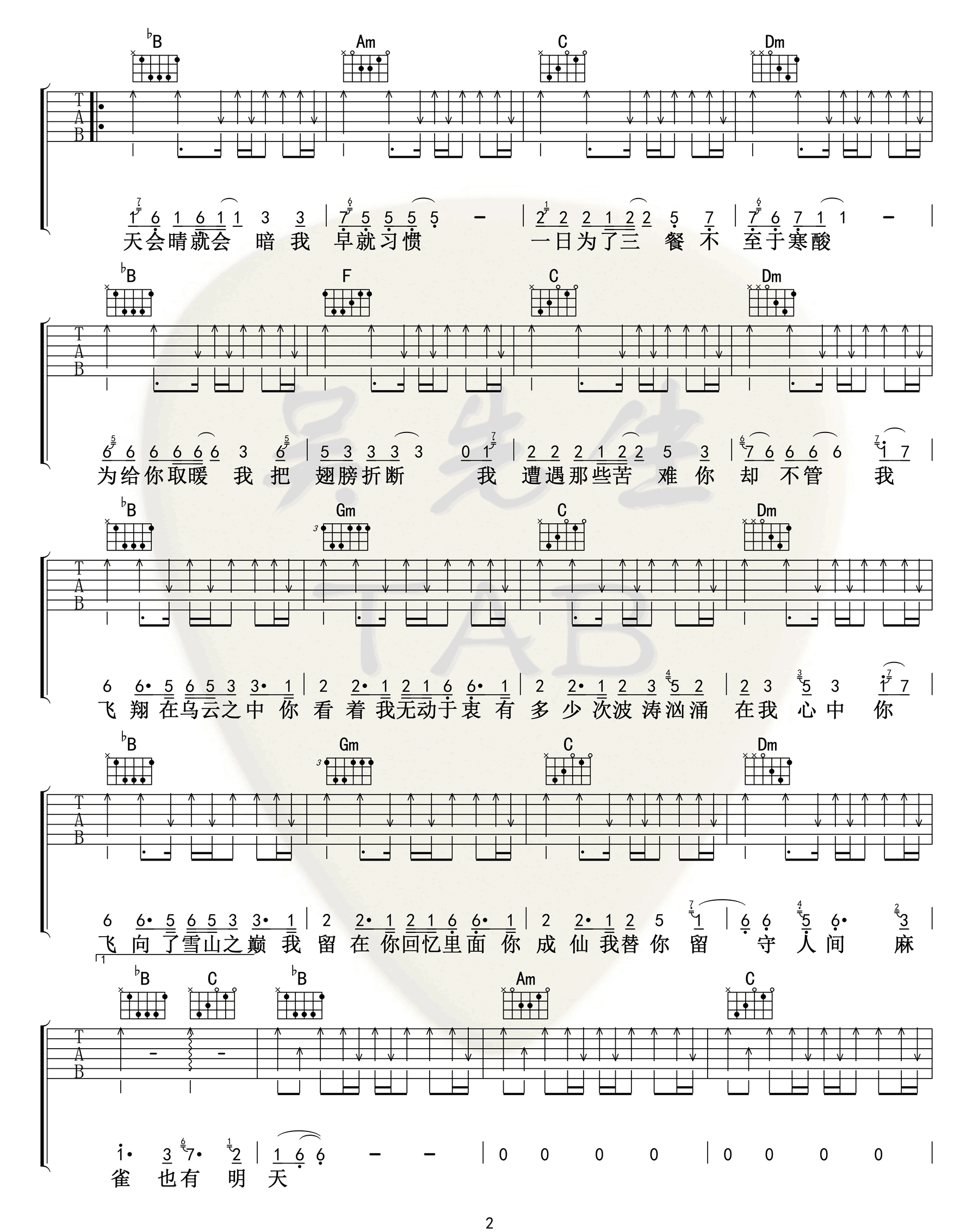 曲谱介绍: 李荣浩《麻雀》吉他弹唱谱,采用F调指法编配原版,共有4张高清图谱。