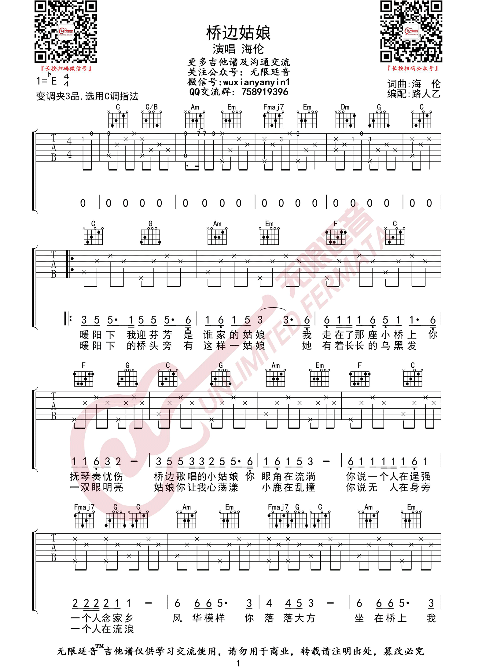 曲谱介绍: 海伦《桥边姑娘》吉他弹唱谱,采用C调指法编配原版,共有2张高清图谱,免翻页排版设计。