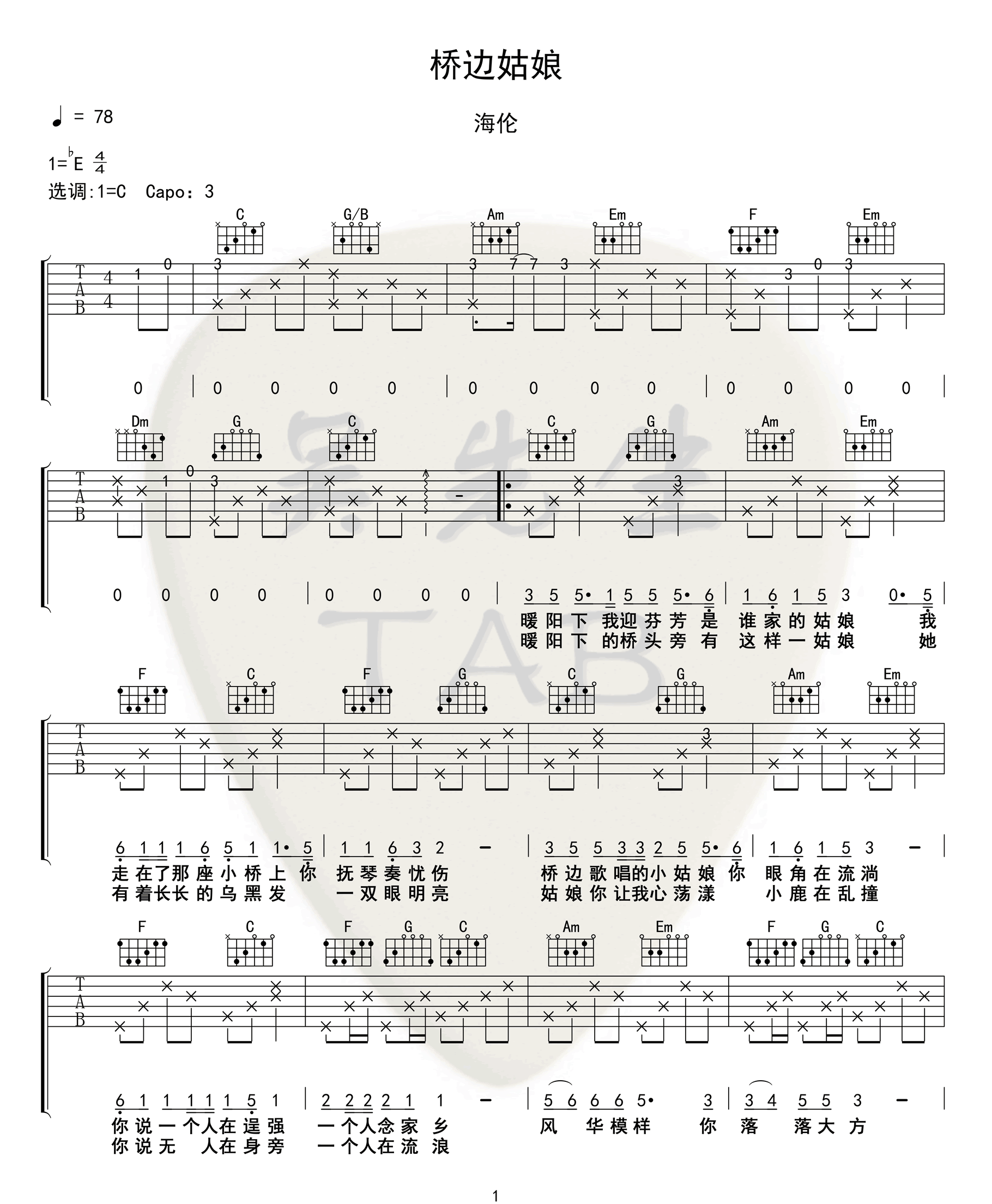 桥边姑娘吉他谱 - 海伦 - C调吉他弹唱谱
