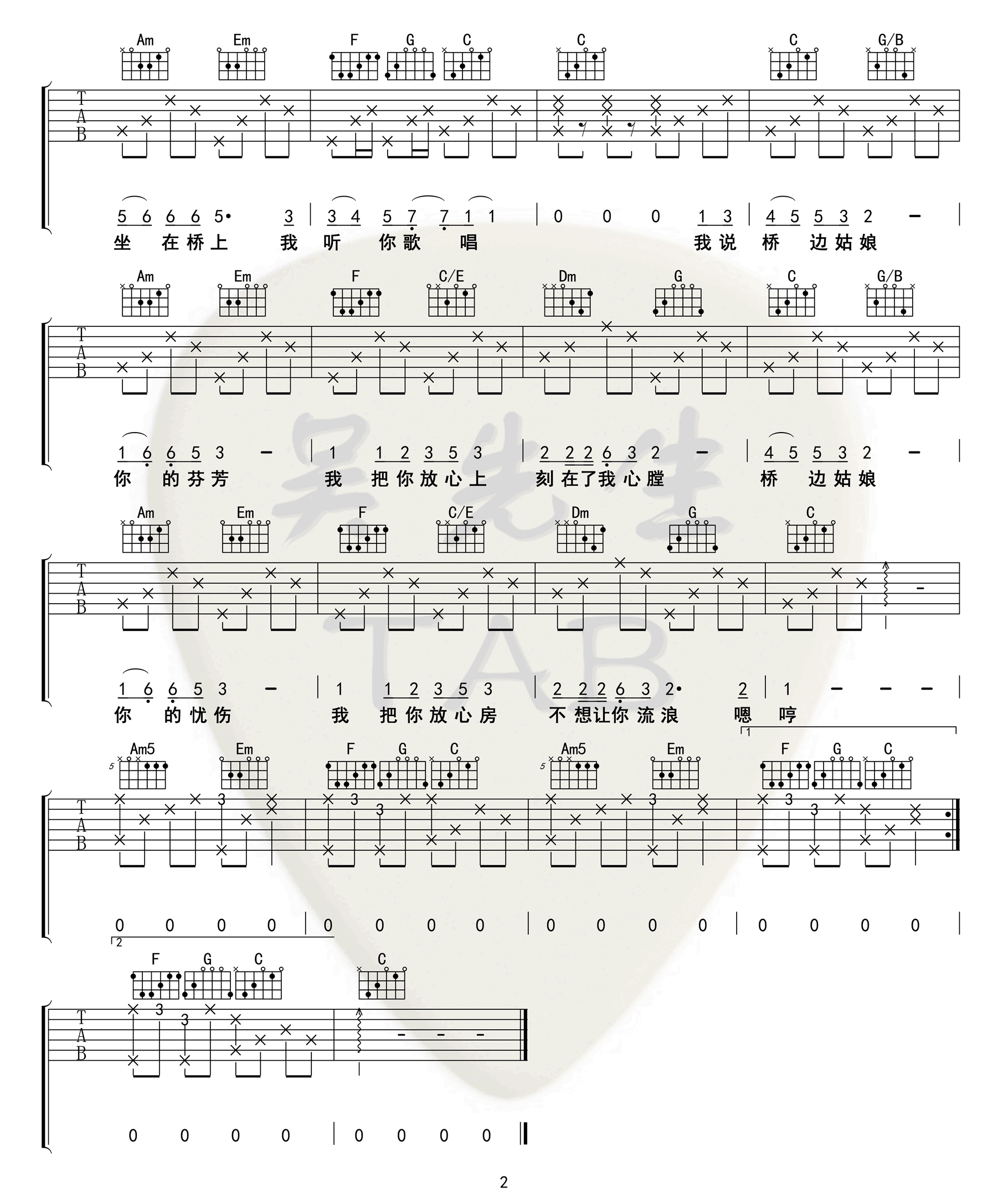 曲谱介绍: 海伦《桥边姑娘》吉他弹唱谱,采用C调指法编配,共有2张高清图谱,免翻页排版设计。