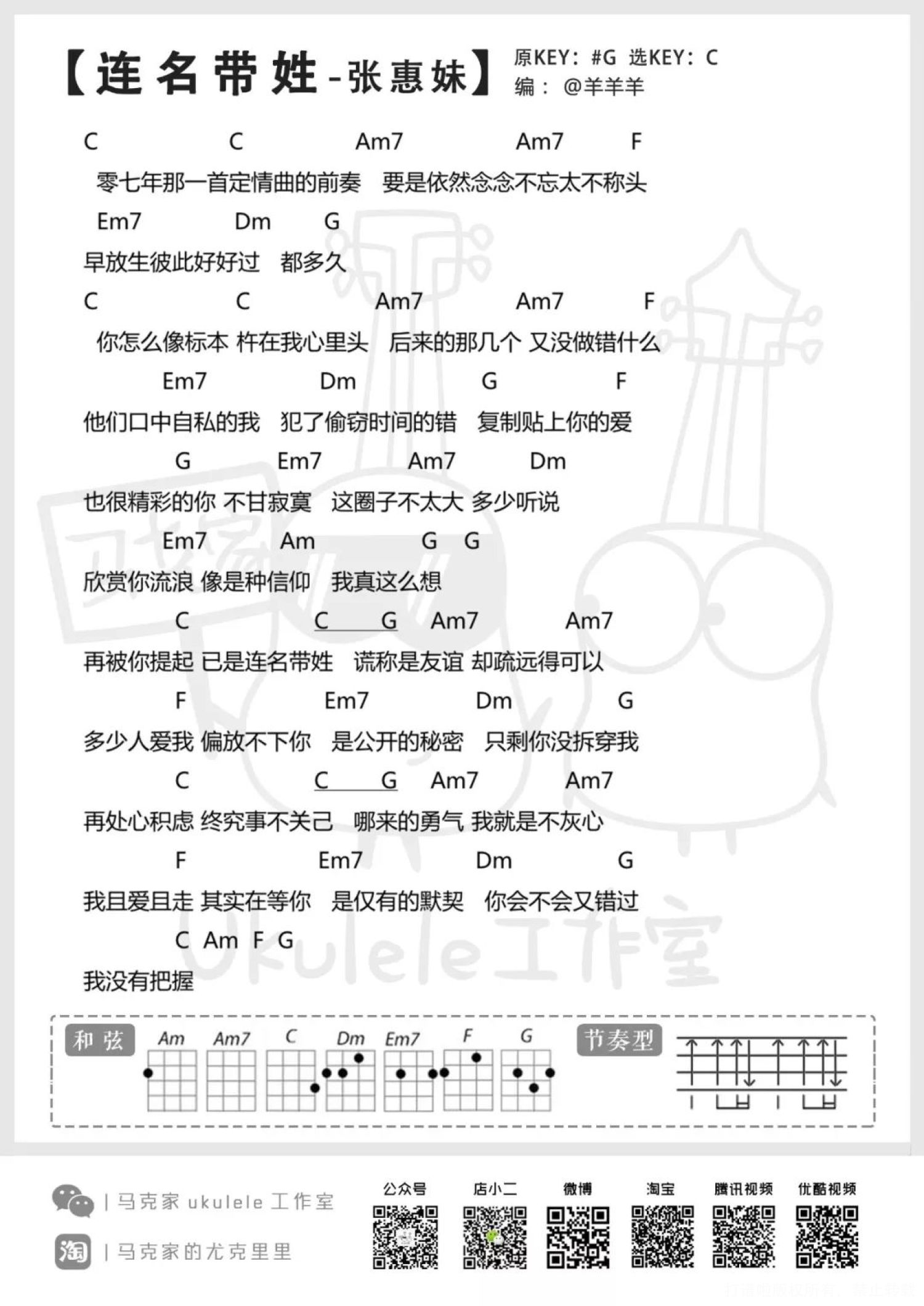 曲谱介绍: 《连名带姓》尤克里里谱 天气突然变得好冷,好不容易睡暖的被窝都不愿意爬出来。 我是一个很喜欢去房顶的人,站在房顶上,俯视着整座城市,仰望着整片天空,整颗心都无比安静。 印象很深的是,高一的冬天,我很喜欢课间的时候跑上楼顶唱歌,不为什么,因为唱唱歌就不冷了,所以我经常跟学生说,唱出来就不冷了。 《连名带姓》这首歌前几个星期就很想跟大家分享,但一直都觉得没什么好状态好心情去做这件事,对,做任何事都得心情好才行。 这首歌我唱了几个星期,一直觉得和弦走势跟《祝我生日快乐》很像,直到前两天在店里练歌,芯语说你等一下,然后就有了今天的这个与《听见下雨的声音》结合的版本。 不要问为什么能把两首歌叠起来唱,因为两首歌的作曲人都是周杰伦。 昨天录完人声部分后,感觉是这几个月以来状态最好的一次,虽然还是很多细节没处理好,但录完的那一刻我是很开心的。 在副歌的部分会有两首歌叠唱的部分,有劳烦JJ老师帮忙调了一下音频,所以希望大家在听歌或者看视频的时候能带个耳机呗,因为分了左右声道来处理。