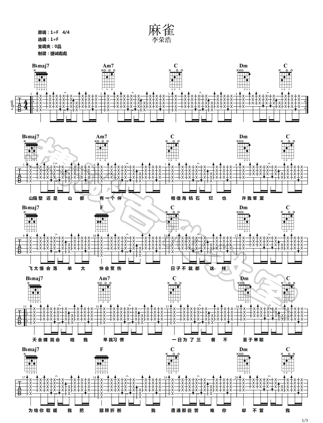曲谱介绍: 李荣浩《麻雀》吉他弹唱谱,采用F调指法编配,共有3张高清图谱。