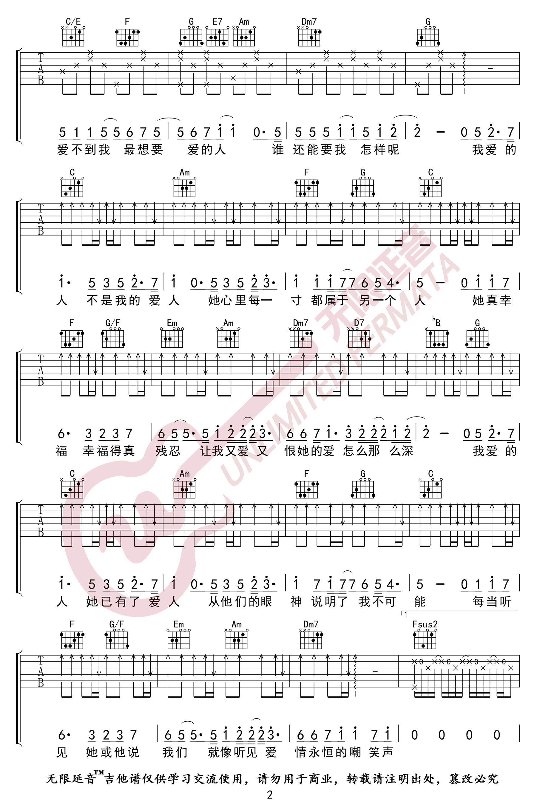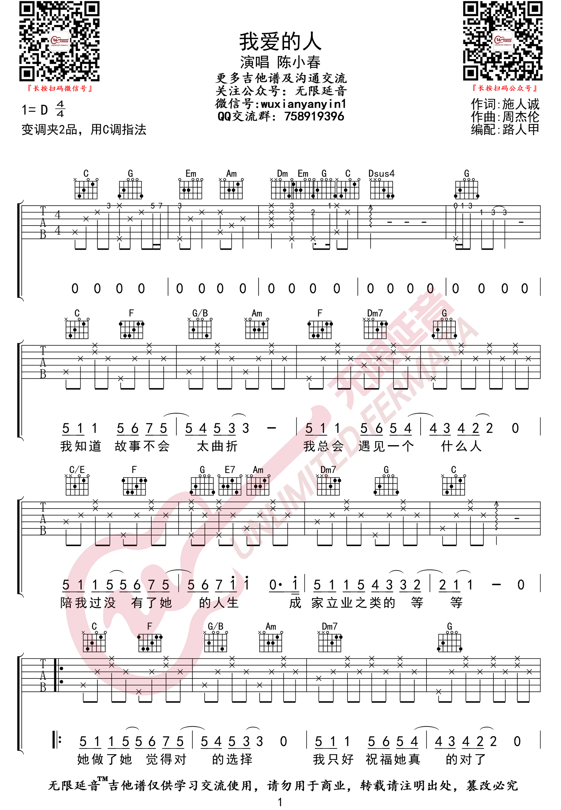 曲谱介绍: 陈小春《我爱的人》吉他弹唱谱,采用C调指法编配原版,共有3张高清图谱。