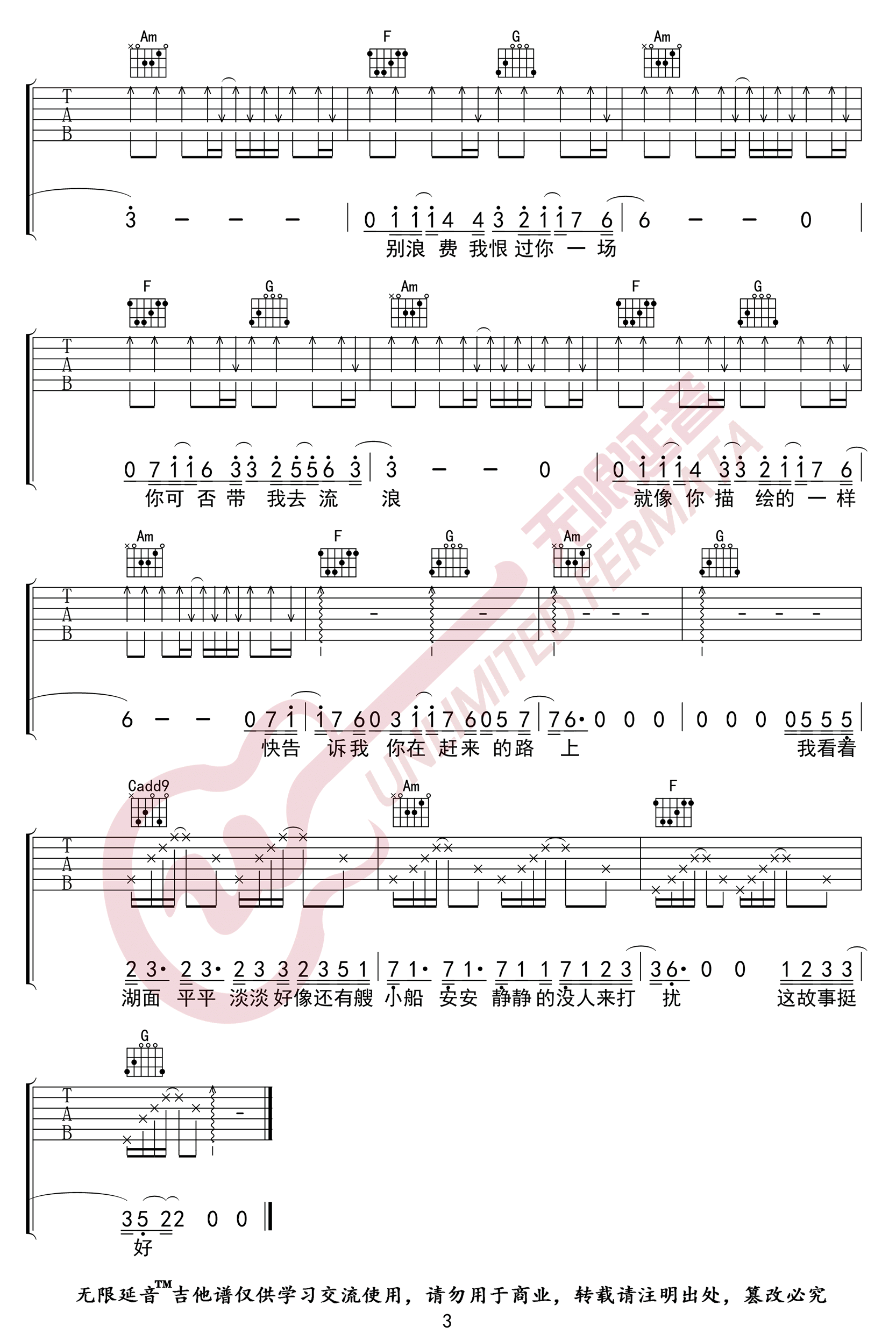曲谱介绍: 薛之谦《陪你去流浪》吉他弹唱谱,采用C调指法编配,共有3张高清图谱。