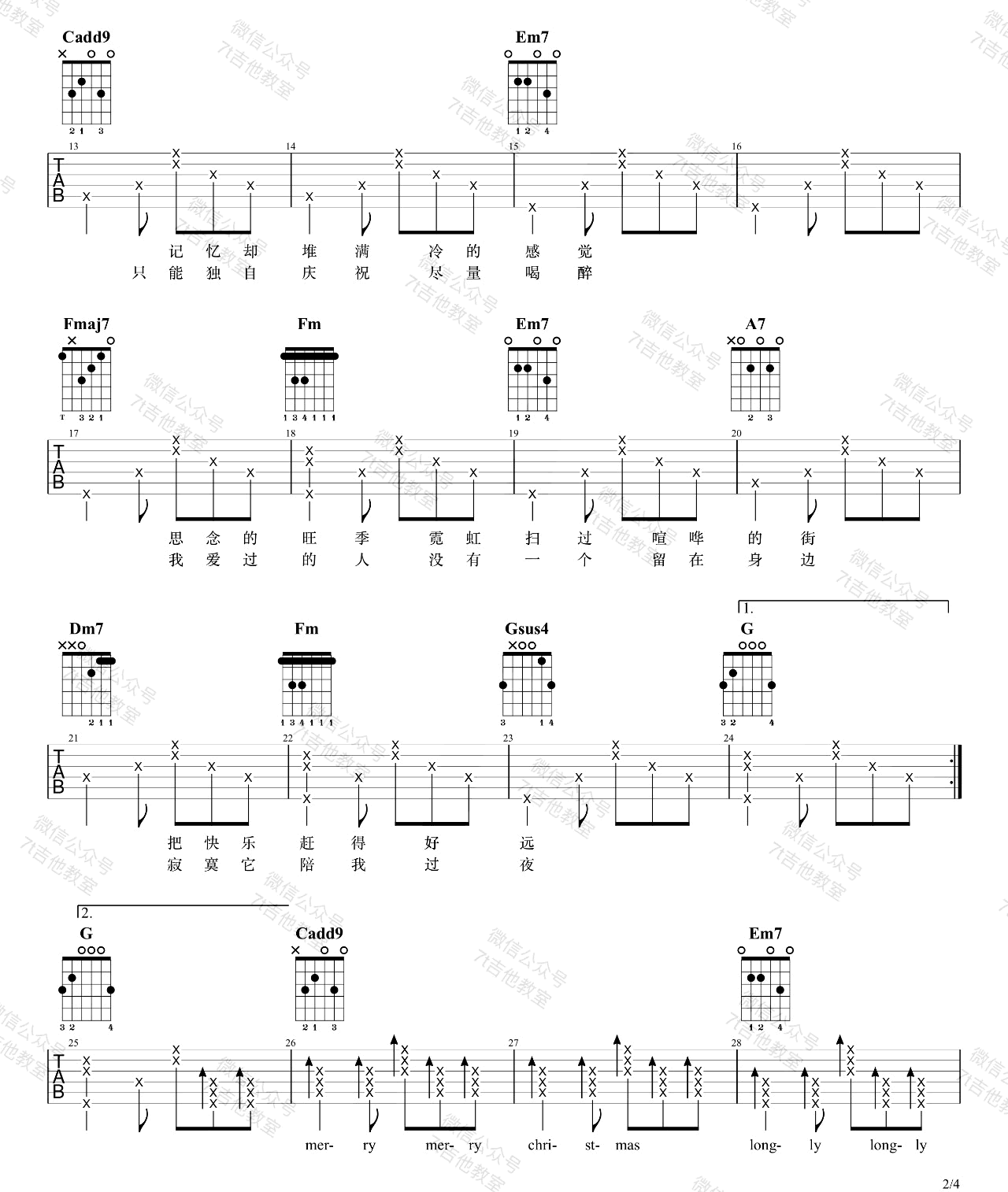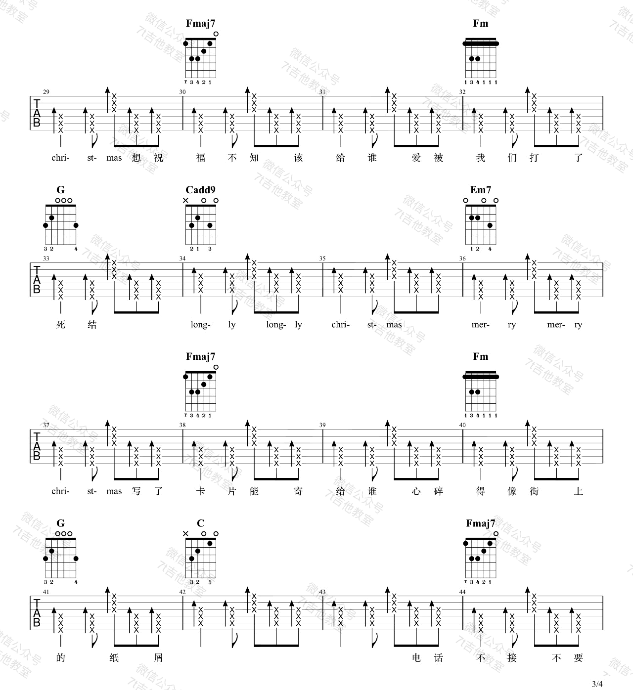 曲谱介绍: 陈奕迅《圣诞结》吉他弹唱谱,采用C调指法编配,共有4张高清图谱。