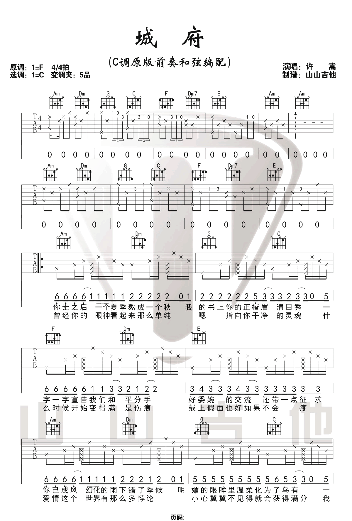 曲谱介绍: 许嵩《城府》吉他弹唱谱,采用C调指法编配原版,共有3张高清图谱。