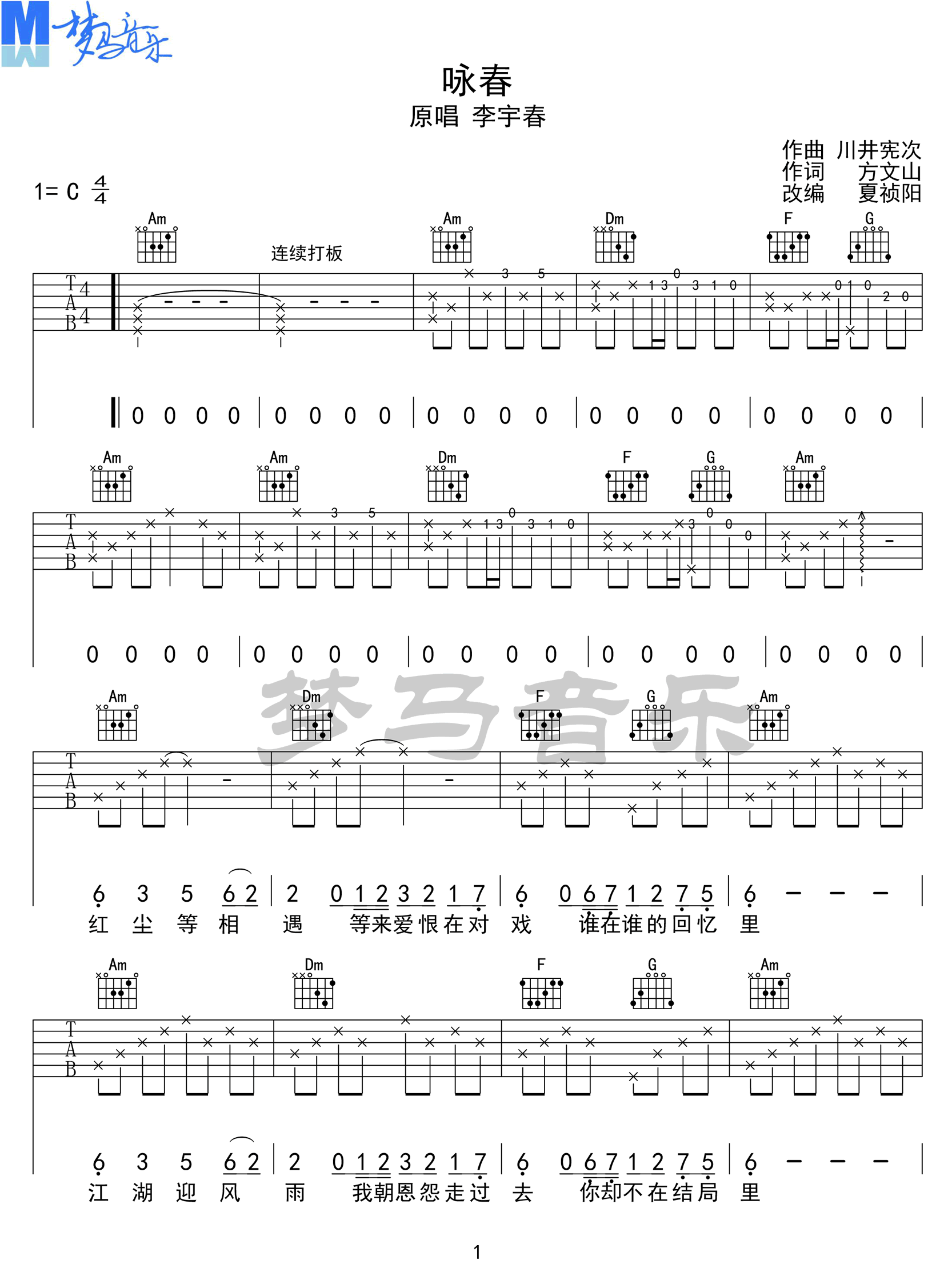 曲谱介绍: 李宇春《咏春》吉他弹唱谱,采用C调指法编配原版,共有4张高清图谱。