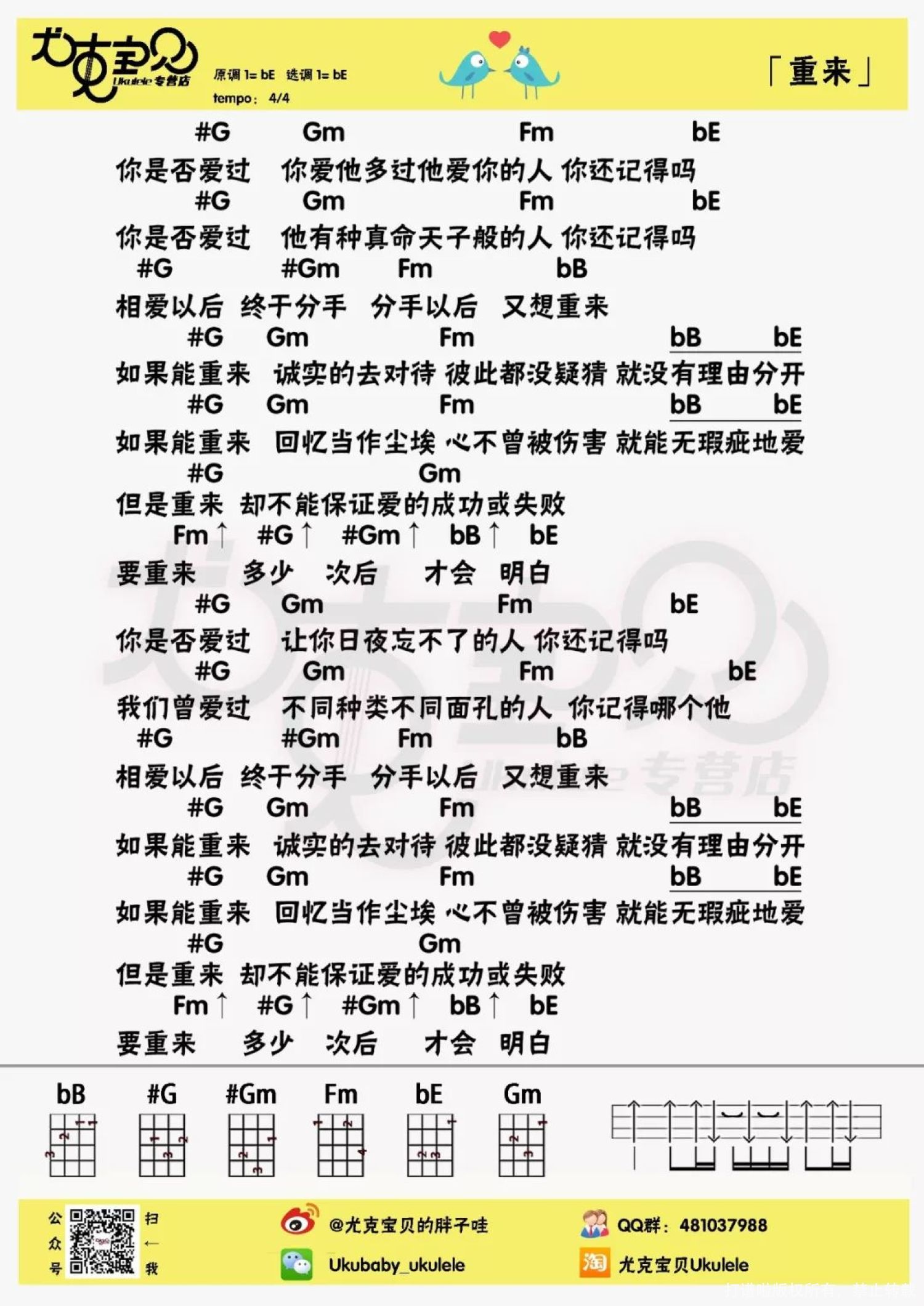 曲谱介绍: @蔡健雅微博: “天啊,真沒想到自己寫了那麼多首歌!很開心 也很感恩宇宙和世界所給我的養分。也謝謝你們讓這些歌走進你們的生活。” 不知道有没有人有同感, 总觉得Tanya写的歌都适合她本人来演绎 而且一定很好听! 终于等到蔡健雅新EP里自己唱的—— 「重来」 (原唱黄小琥,作词作曲蔡健雅) 重来 尤克里里弹唱谱