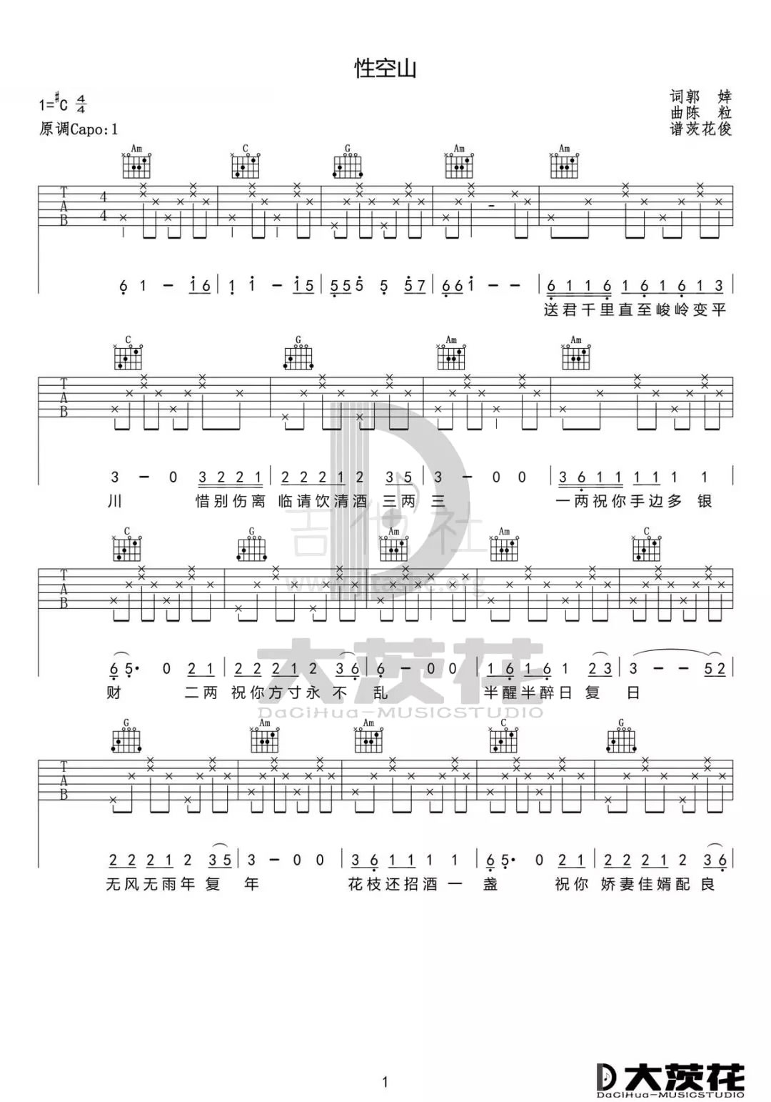 曲谱介绍: 陈粒《性空山》吉他弹唱谱,采用C调指法编配,共有2张高清图谱,免翻页排版设计。