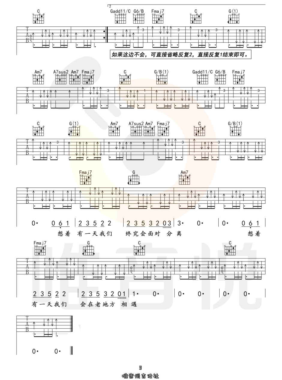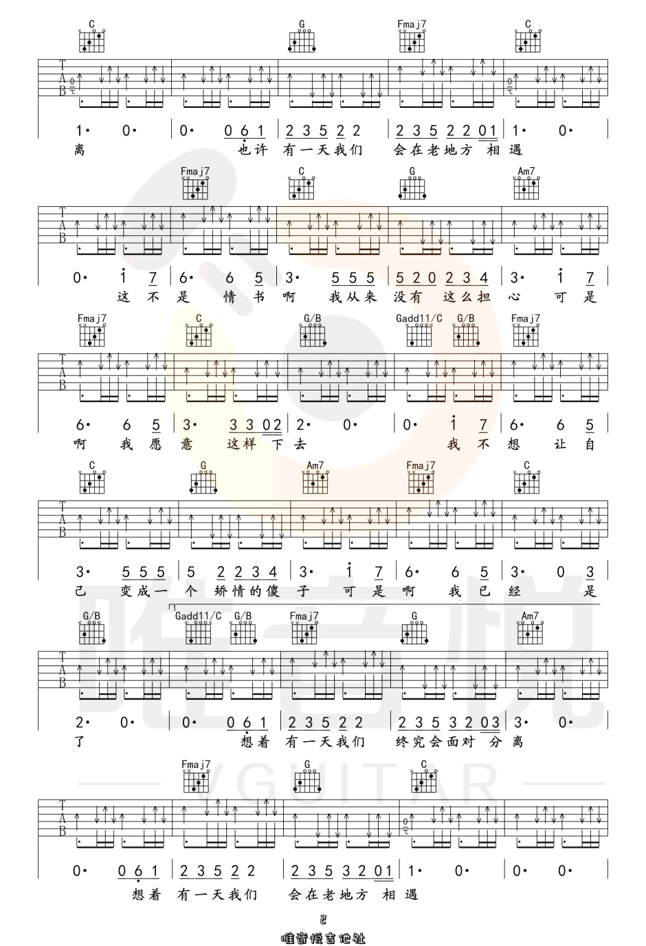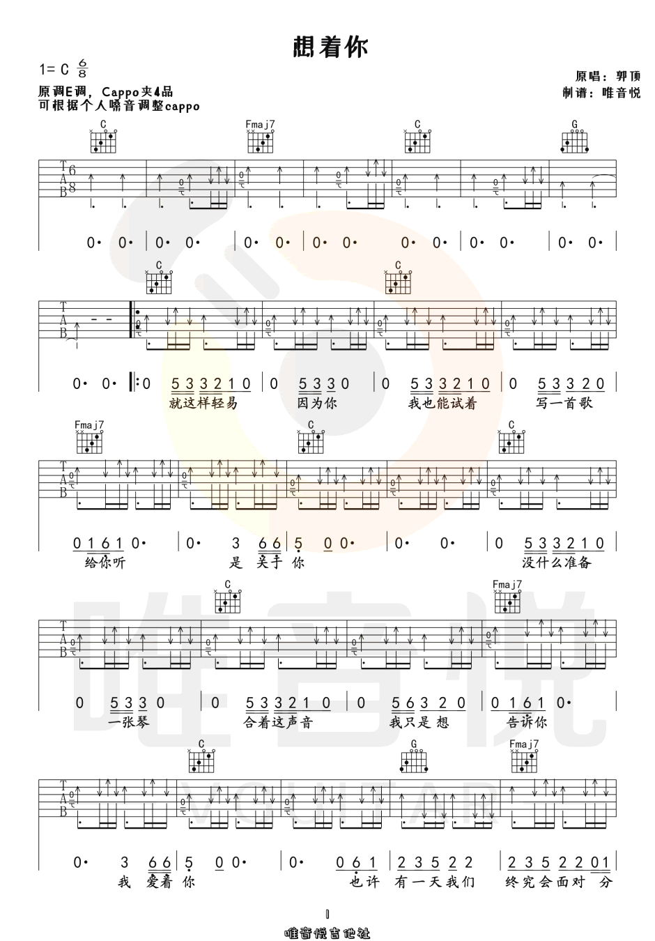 曲谱介绍: 郭顶《想着你》吉他弹唱谱,采用C调指法编配原版,共有3张高清图谱。