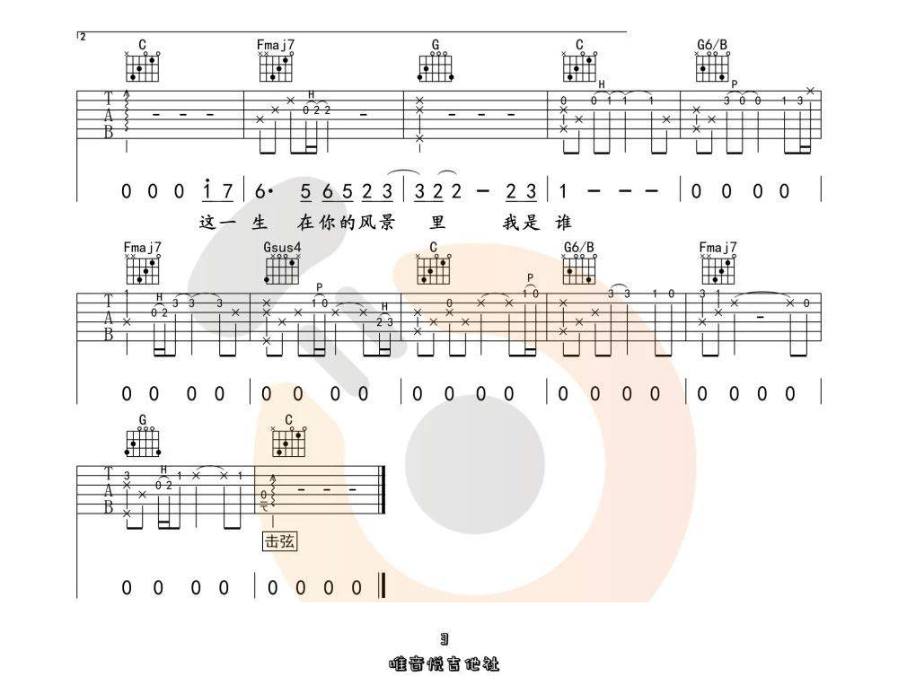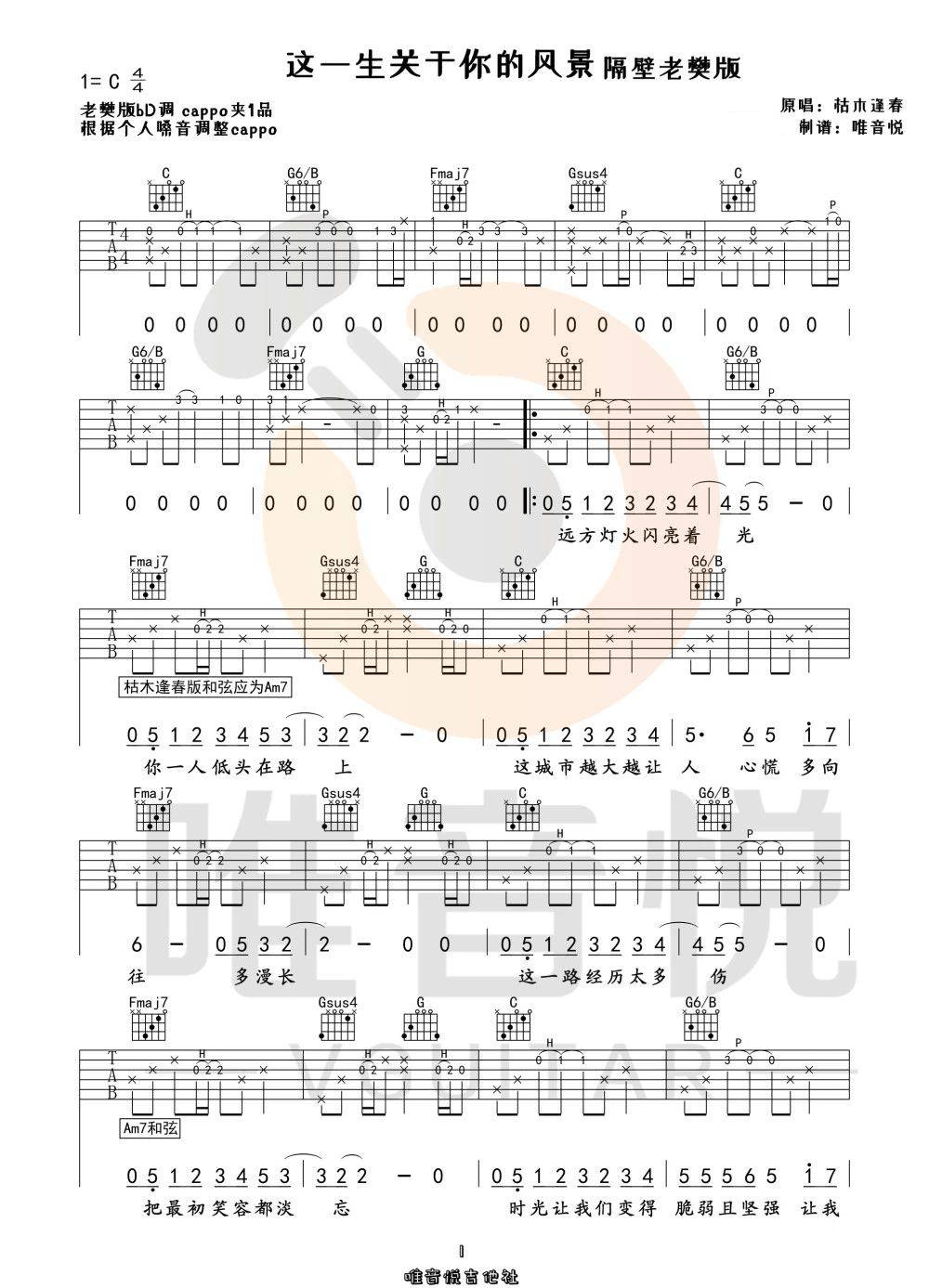 曲谱介绍: 隔壁老樊《这一生关于你的风景》吉他弹唱谱,采用C调指法编配,共有3张高清图谱。