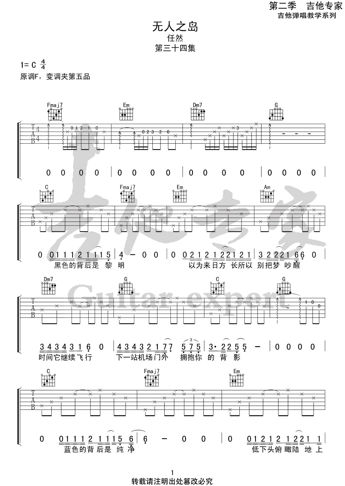 曲谱介绍: 任然《无人之岛》吉他弹唱谱,采用C调指法编配,共有3张高清图谱。