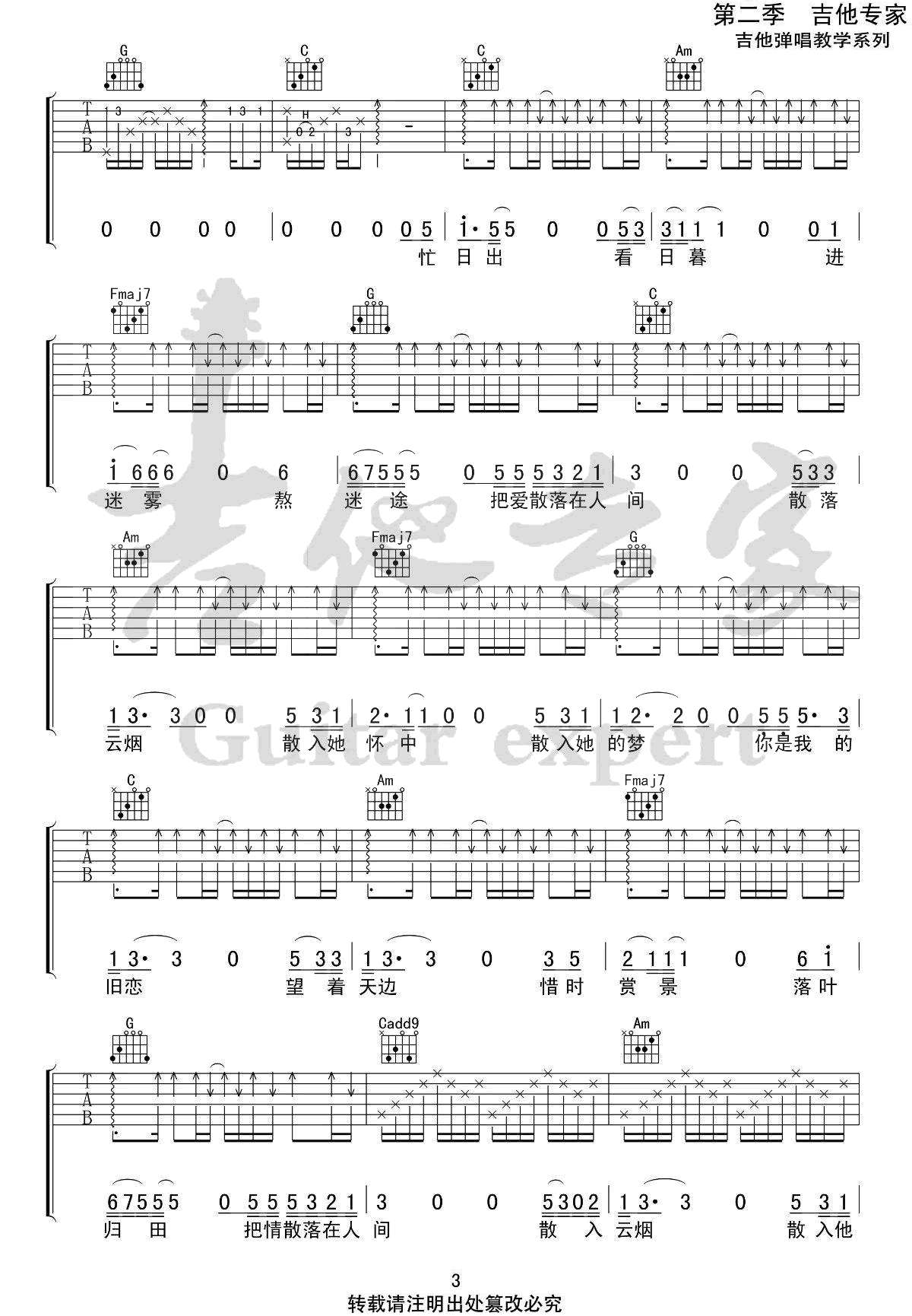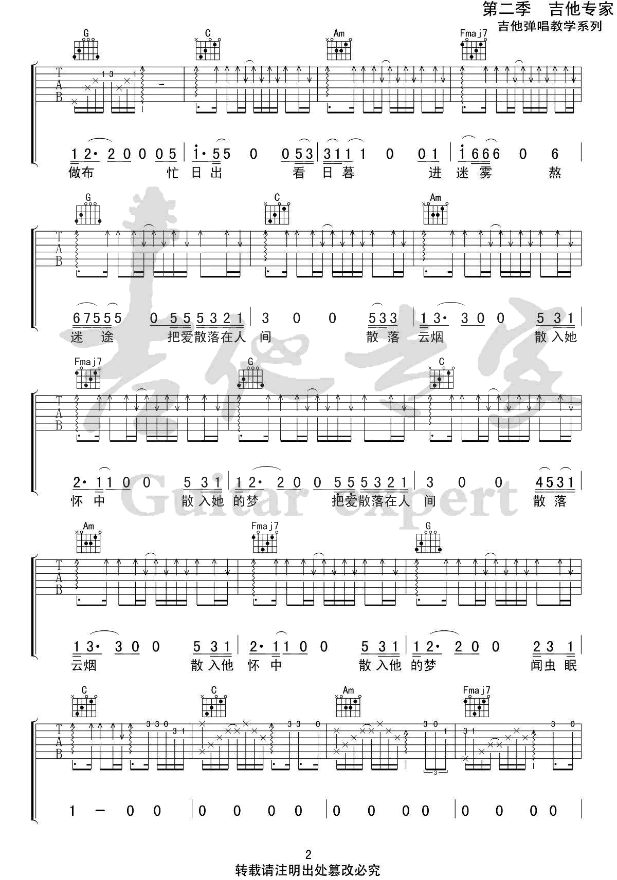 曲谱介绍: 隔壁老樊《把爱散落在人间》吉他弹唱谱,采用C调指法编配原版,共有4张高清图谱。