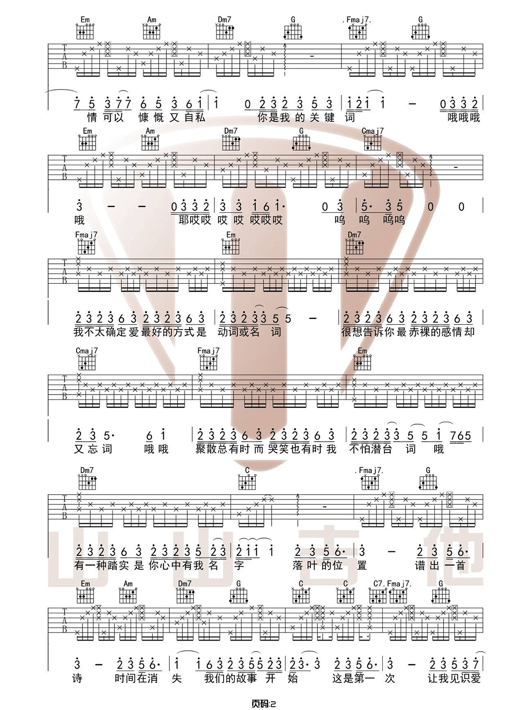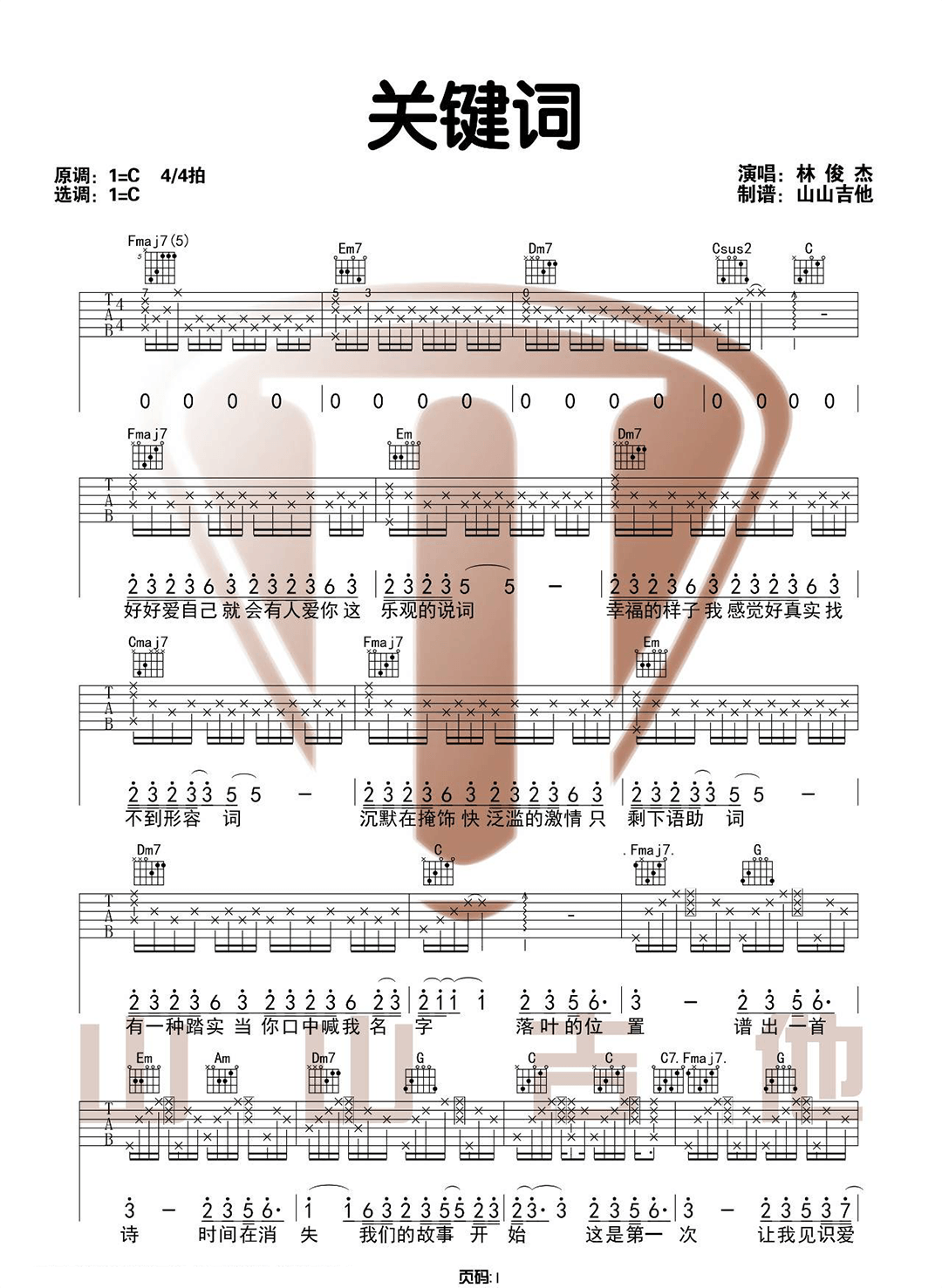 曲谱介绍: 林俊杰《关键词》吉他弹唱谱,采用C调指法编配原版,共有3张高清图谱。