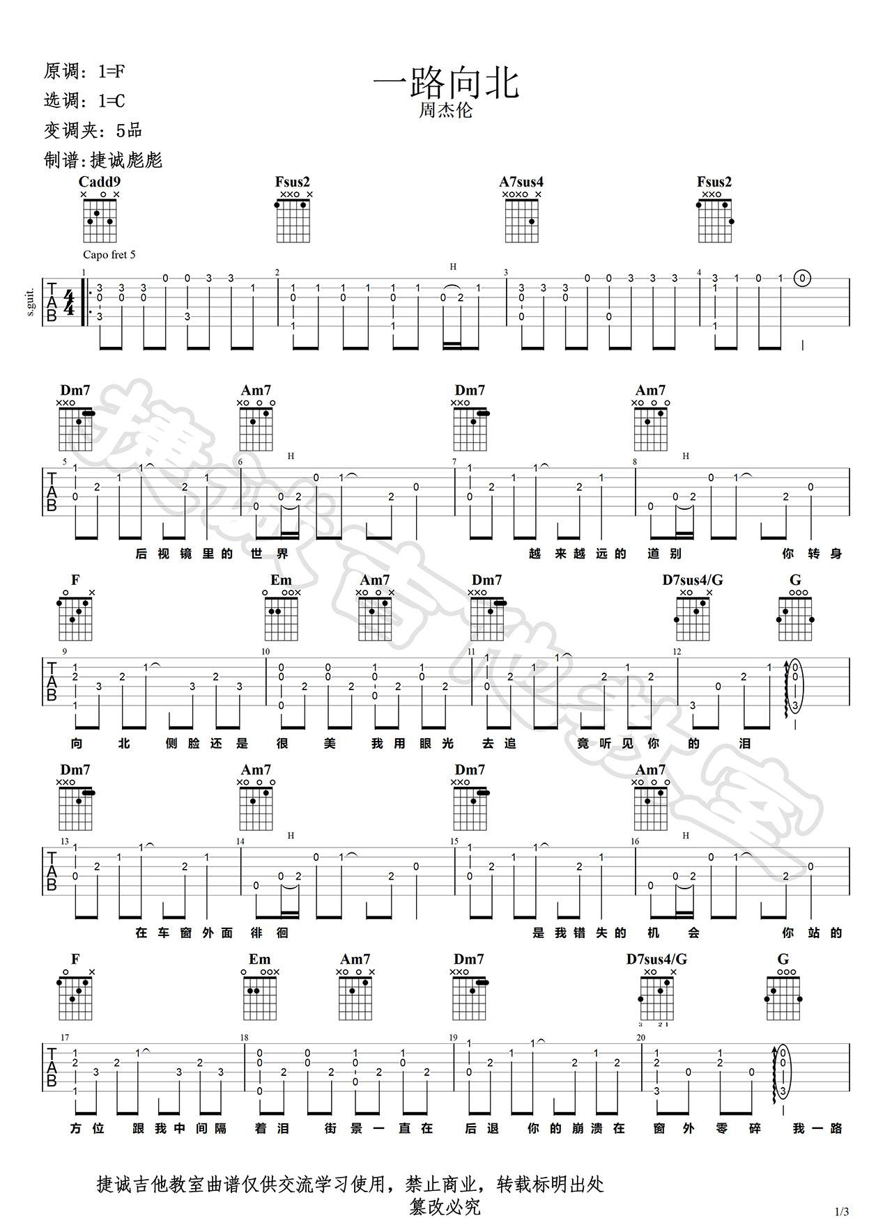 曲谱介绍: 周杰伦《一路向北》吉他弹唱谱,采用C调指法编配原版,共有2张高清图谱,免翻页排版设计。