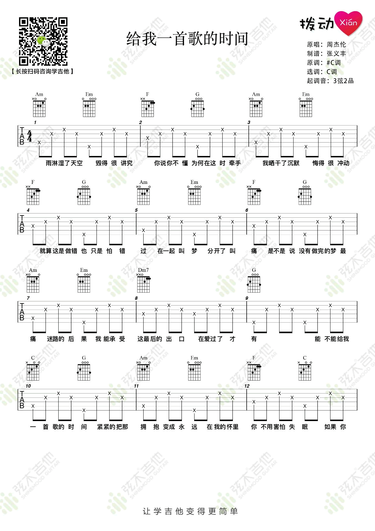 曲谱介绍: 给我一首歌的时间吉他谱,周杰伦演唱经典R&B情歌,唱出时下浪漫的爱情。原调升C选调C,起调音3弦2品,两张弹唱图片谱。弦木吉他编配出品,琴谱网整理上传分享。