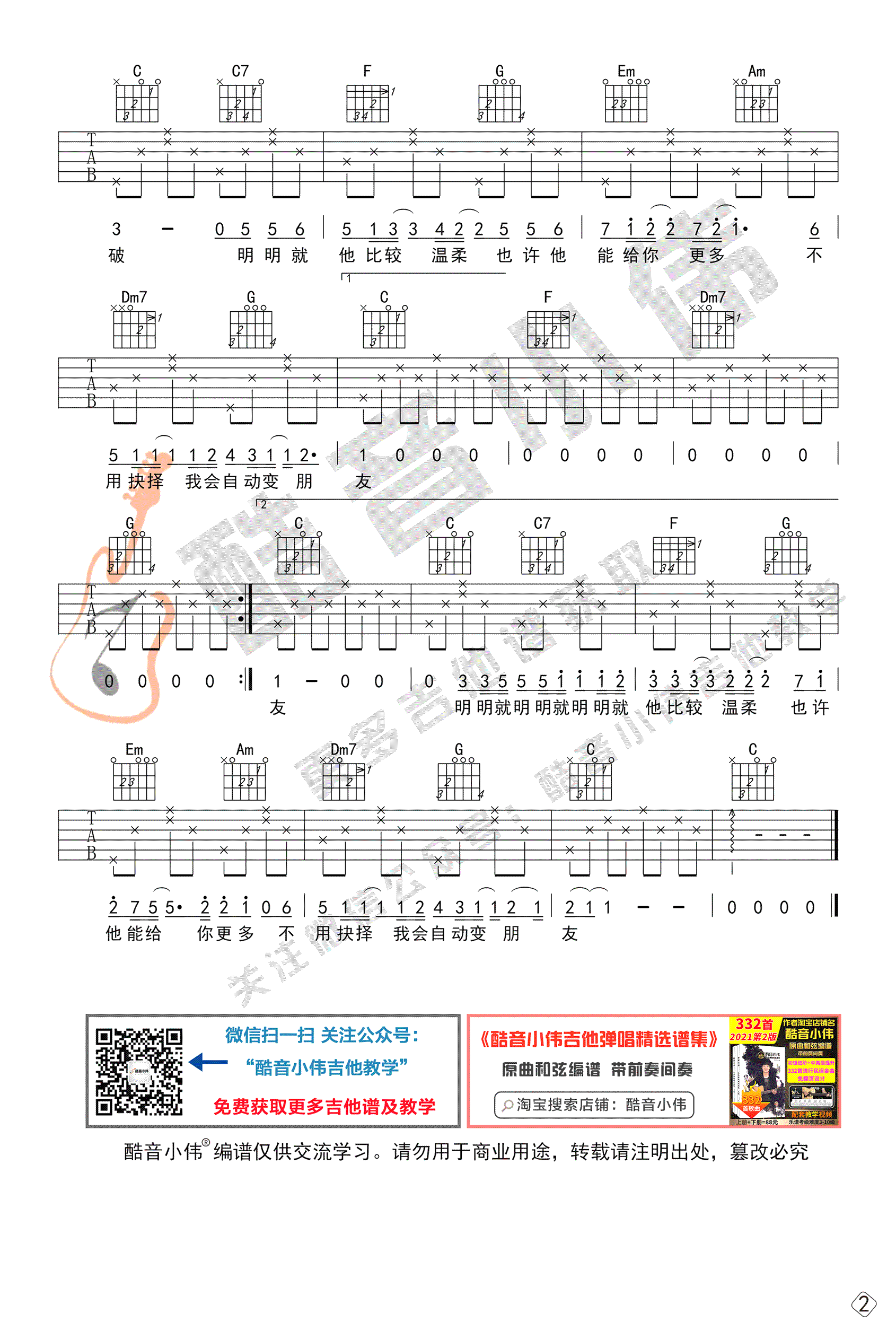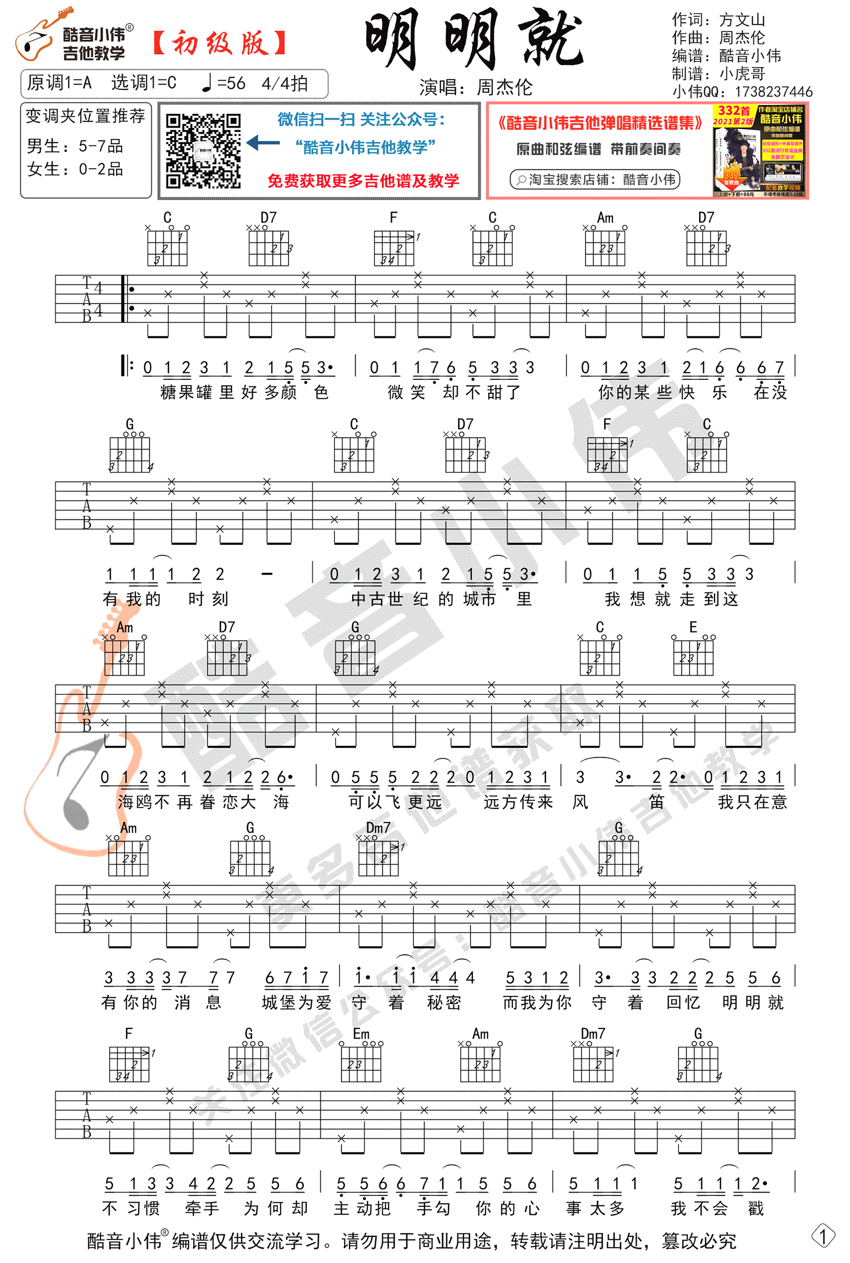 曲谱介绍: 明明就吉他谱,初级难度编配,周杰伦的一首温柔情歌,明明就吉他弹唱谱,原调A选调C,变调夹推荐位置,男生5-7品女生0-2品,高清图片谱共两张谱例。琴谱网感谢酷音小伟制谱出品。