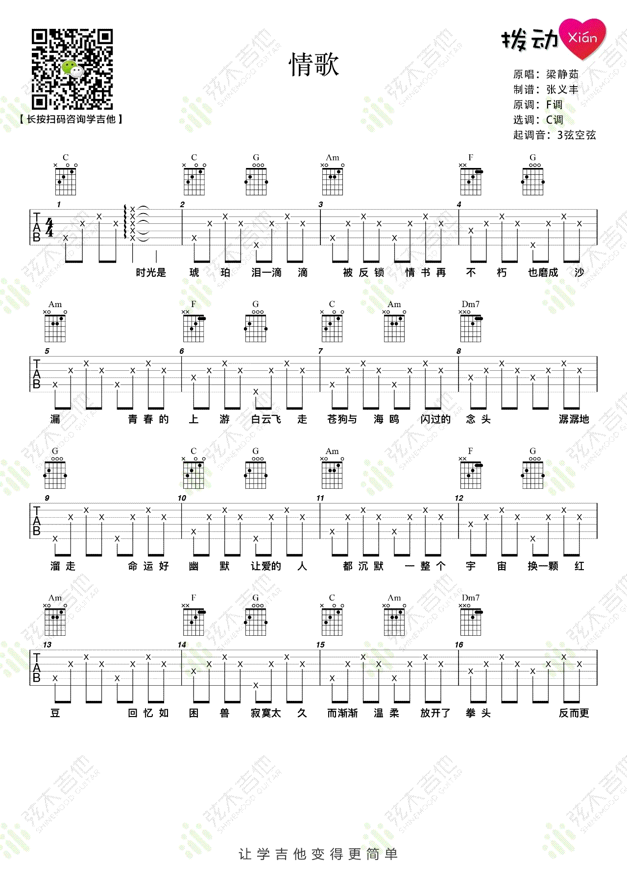 曲谱介绍: 情歌吉他谱,梁静茹演唱的一首让人沉淀而感动的经典情歌,中国台湾青春偶像剧《败犬女王》插曲。情歌吉他弹唱谱,原调F选调C,起调音3弦空弦,两张图片六线谱。弦木吉他编配出品,琴谱网更新上传。 吉他和弦虽然简单但绝对是亮点,梁静茹歌声自带温柔光环,唱出时光流逝物是人非的感慨。随谱附上《情歌》吉他弹唱演示视频,琴友们就跟着我们的张老师来学学这首歌吧~