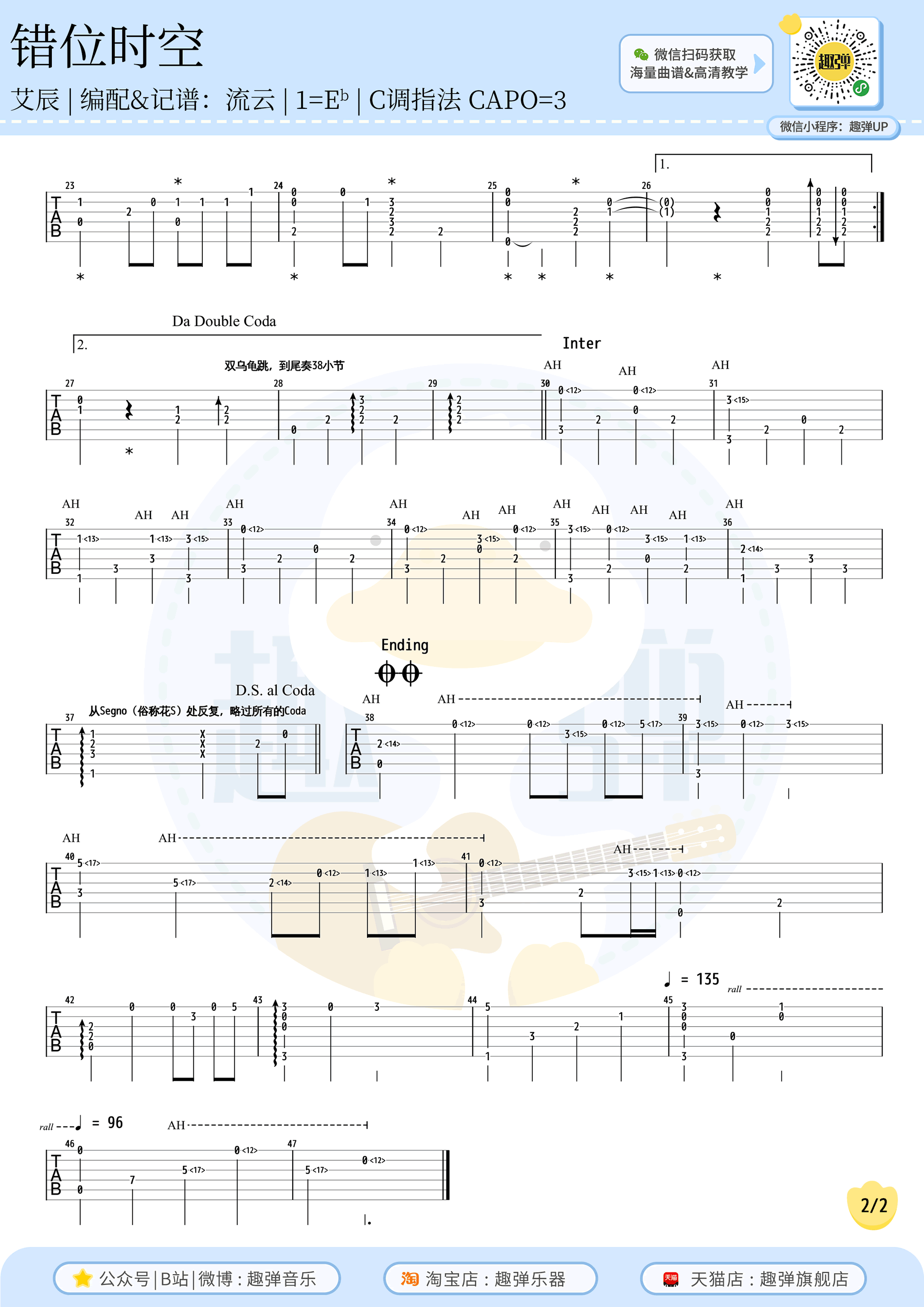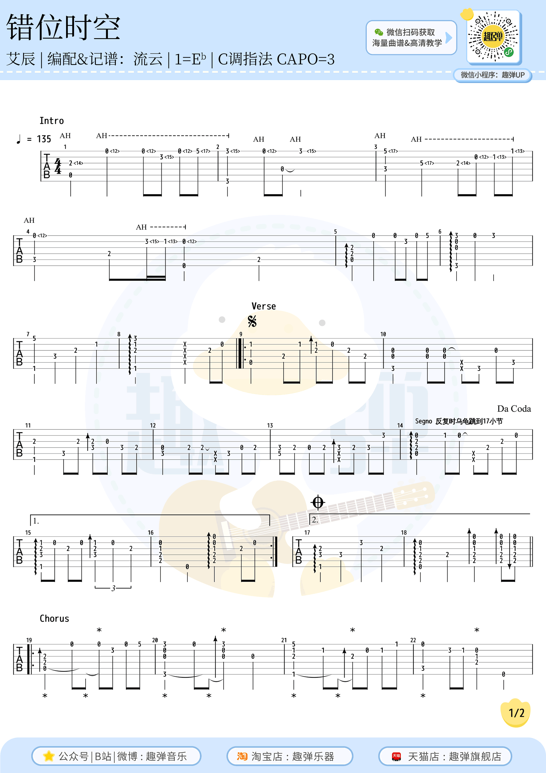 曲谱介绍: 错位时空指弹吉他谱,根据艾辰的一首凄美泪目的热门歌曲改编,错位时空吉他独奏谱,选用C调指法编配,变调夹夹三品,两张高清弹唱图片谱。感谢趣弹音乐出品,琴谱网更新上传。