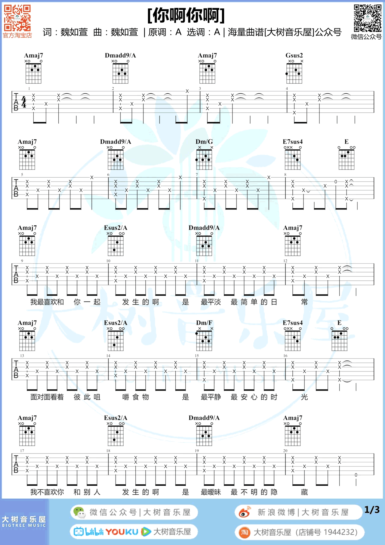 曲谱介绍: 你啊你啊吉他谱,魏如萱演唱的一首原创歌曲,也是电视剧《用九柑仔店》插曲。你啊你啊吉他六线谱,选用A调指法,三张图片谱。感谢大树音乐屋编配分享,琴谱网整理更新。 随谱附上橙子老师带来的《你啊你啊》吉他弹唱视频,歌曲女生原调不用变调夹,男生建议1-2品,这首歌弹唱结合会比较难,琴友们可以先把弹奏练熟了,再把唱加进来。