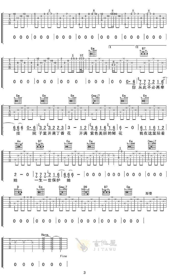 曲谱介绍: 唐磊《丁香花》吉他弹唱谱,采用G调指法编配原版,共有3张高清图谱。