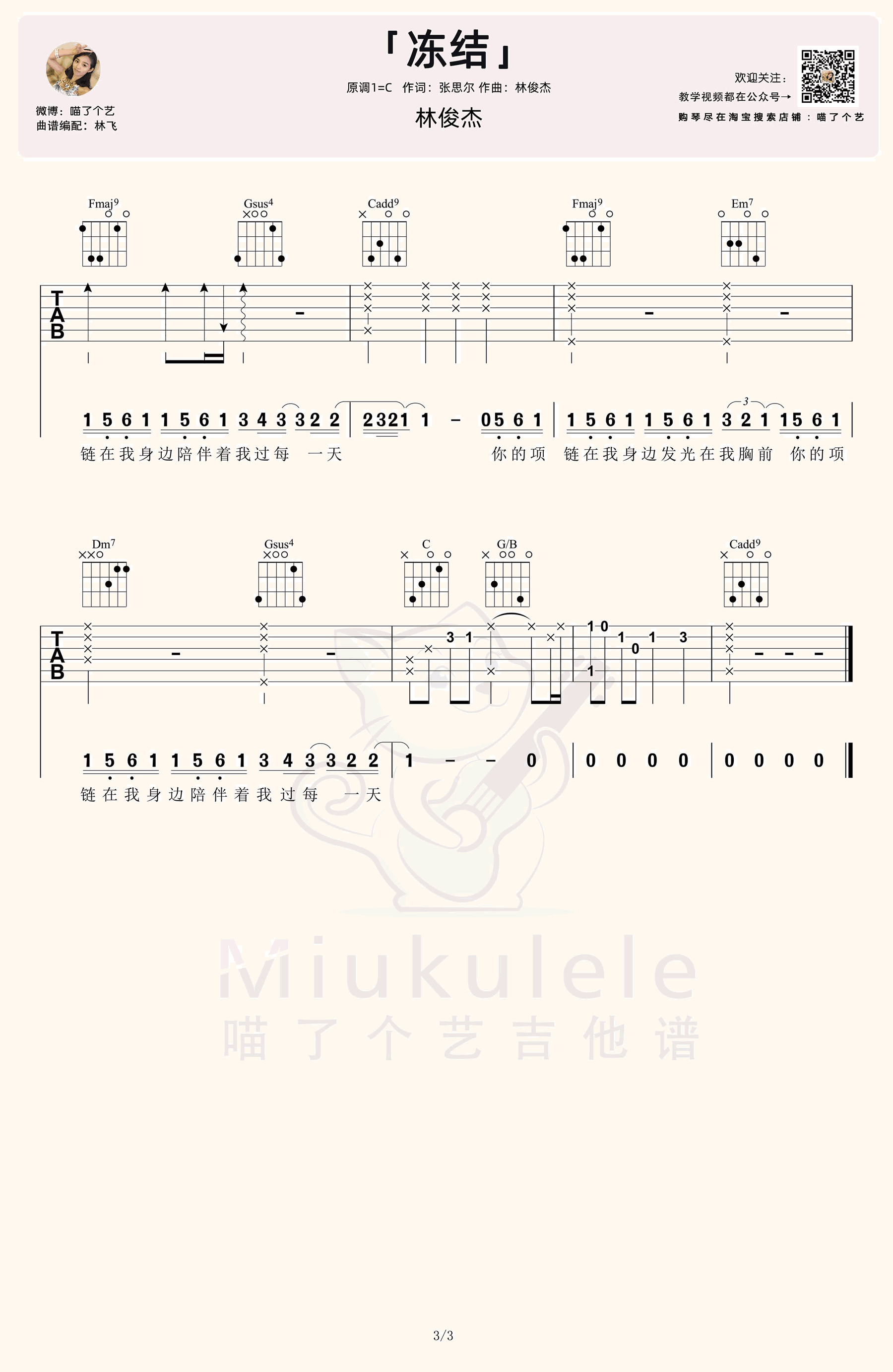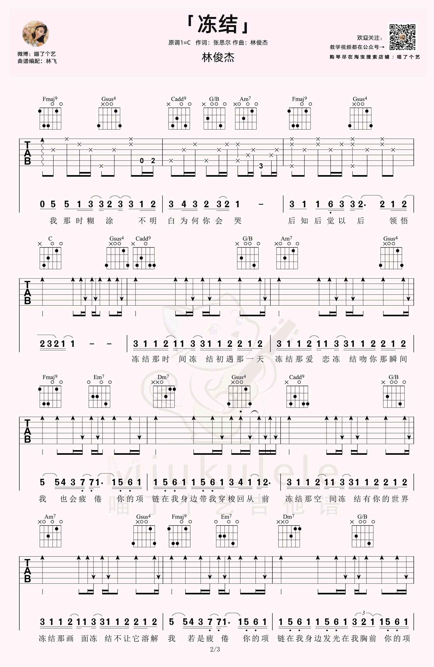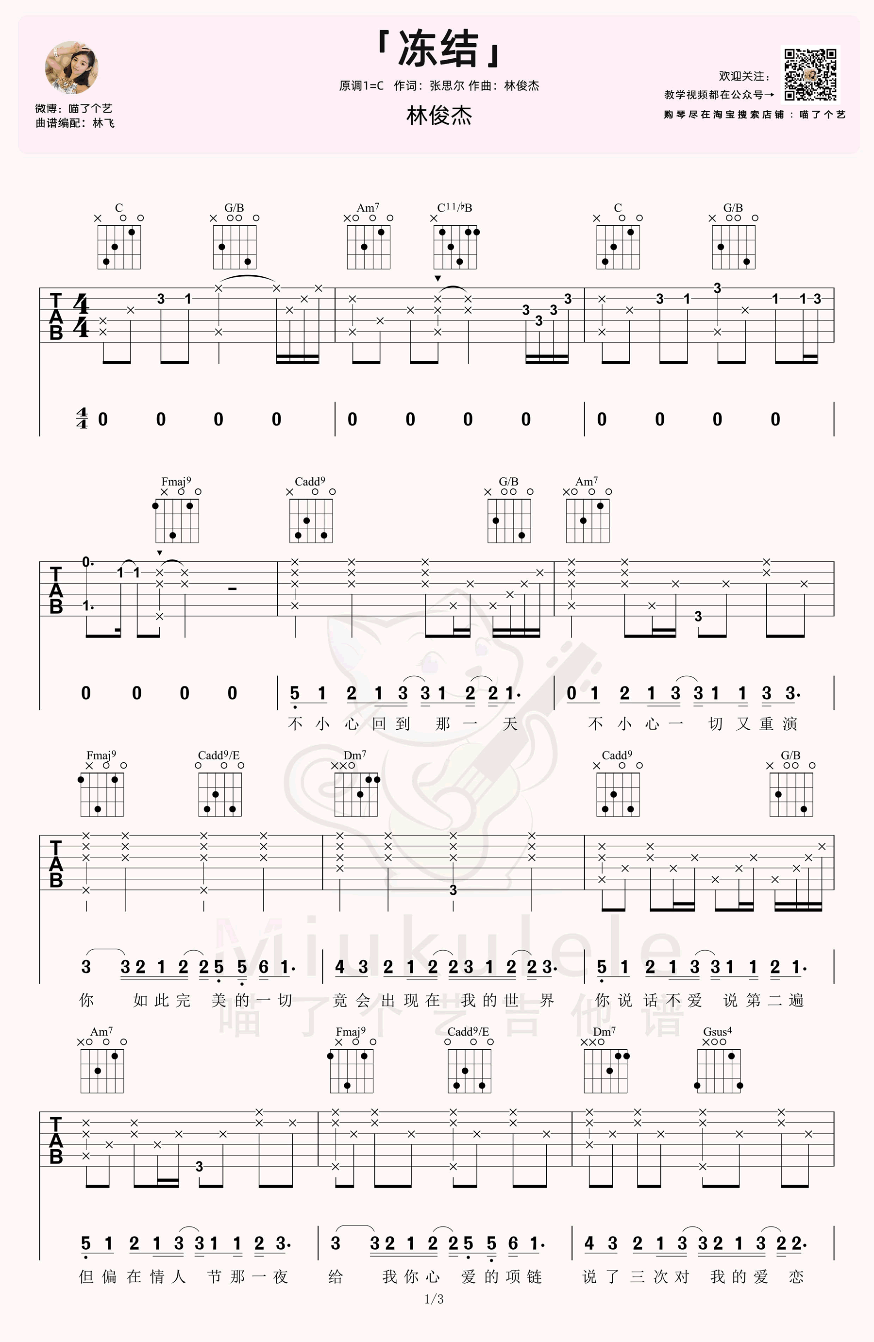 曲谱介绍: 冻结吉他谱,林俊杰的一首早期经典情歌,《冻结》吉他六线谱,C调和弦指法,三张高清弹唱图片谱,喵了个艺编配制谱,并送上吉他弹唱演示视频,琴谱网整理更新。