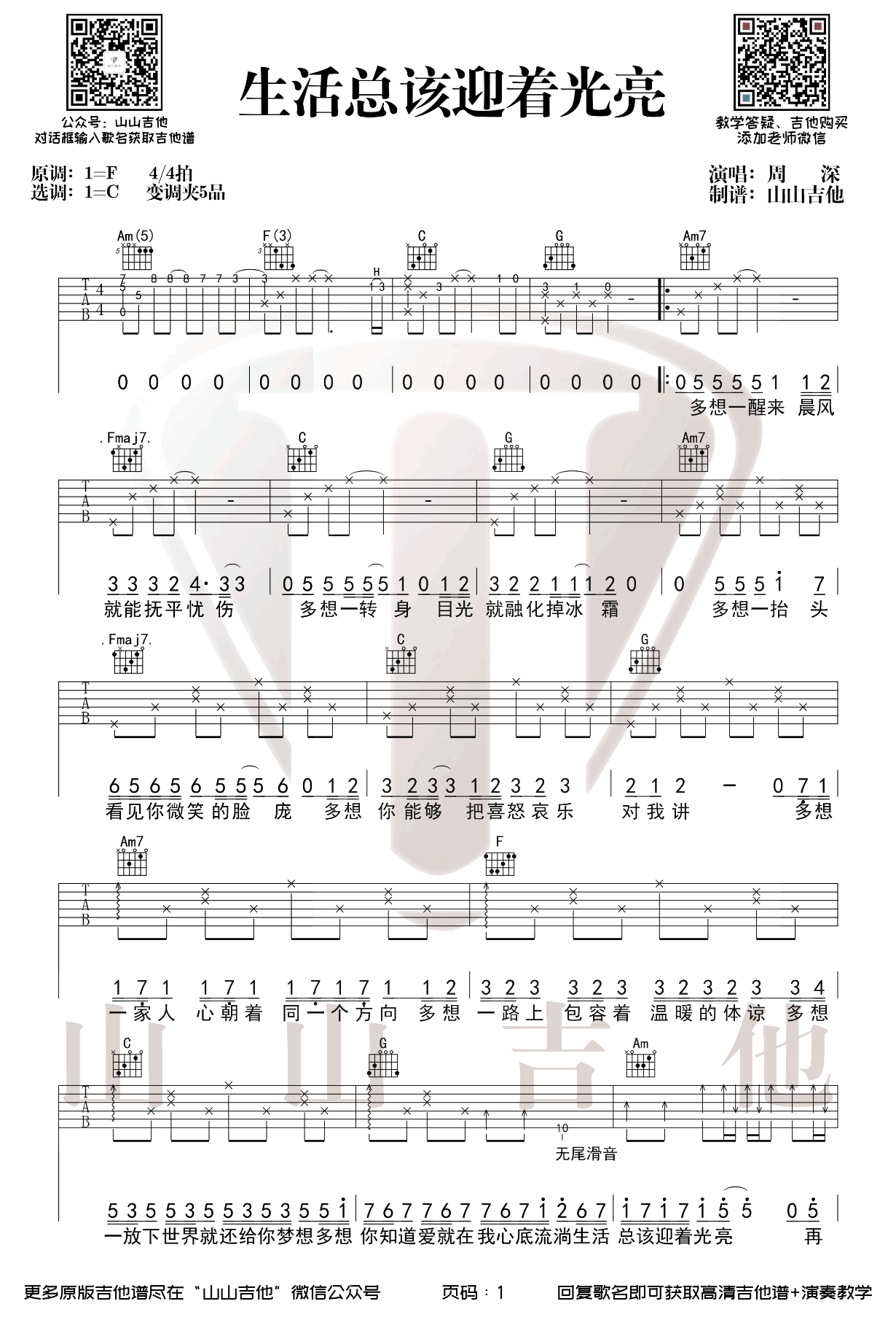 曲谱介绍: 生活总该迎着光亮吉他谱,周深献唱电视剧《乔家的儿女》主题曲。生活总该迎着光亮吉他六线谱+弹唱教学视频,原调F选调C,变调夹夹五品。两张图片谱,感谢山山吉他出品分享。