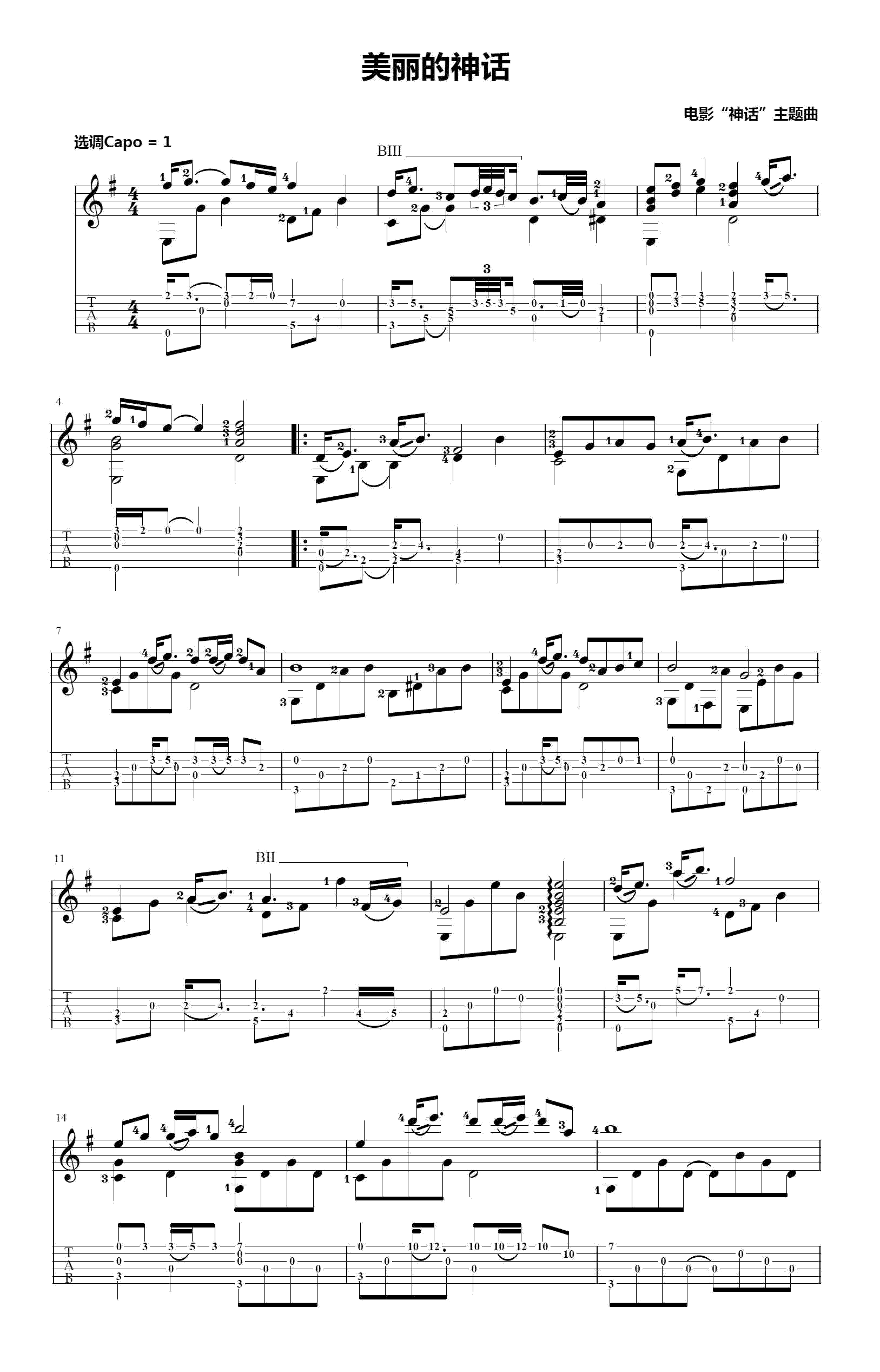曲谱介绍: 美丽的神话指弹吉他谱,根据成龙金喜善电影《神话》主题曲改编。美丽的神话吉他独奏谱,CAPO夹一品,三张图片谱。琴谱网更新上传,大智吉他编配出品。