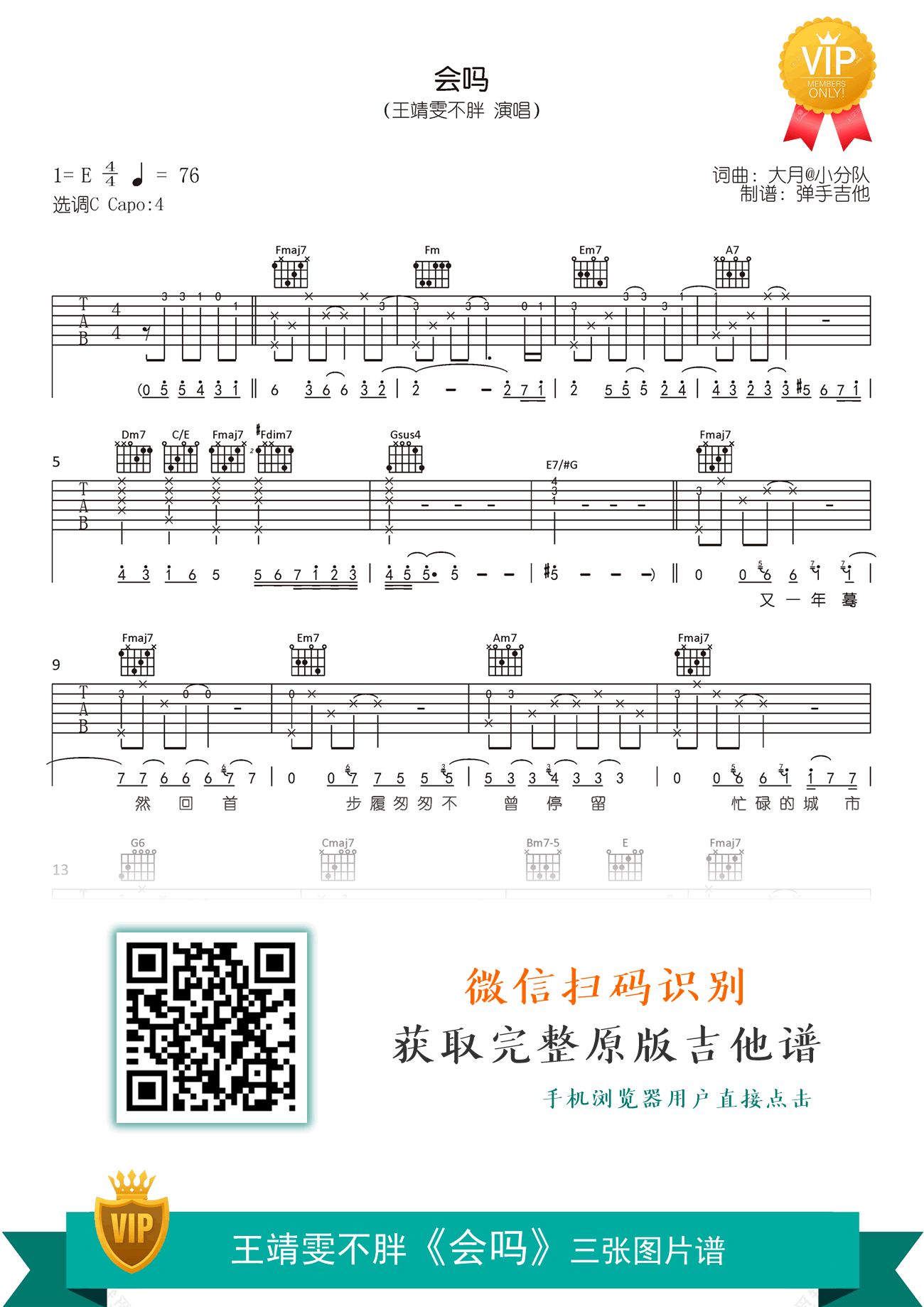 曲谱介绍: 会吗吉他谱,王靖雯不胖演唱,会吗吉他弹唱谱,原调E,变调夹夹第四品,选用C调指法编配,高清完整版共三张图片六线谱,琴谱网整理推荐。