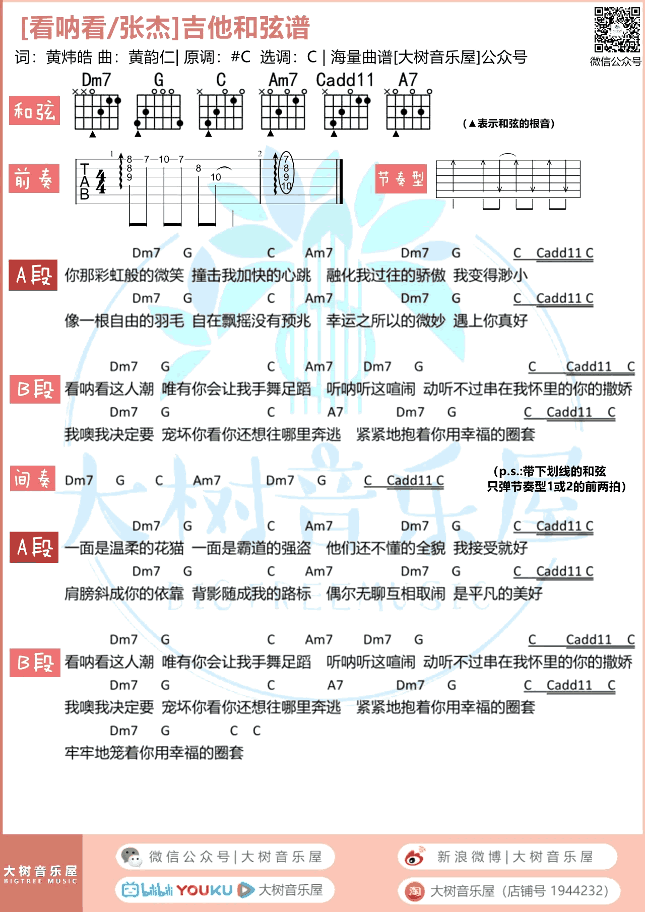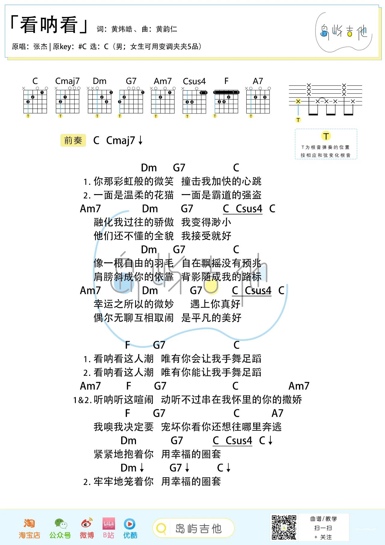 曲谱介绍: 看呐看吉他谱,张杰新专辑一首温暖甜蜜的歌曲,《看呐看》吉他弹唱谱,C调指法编配,前奏与节奏型参见图片谱标注。感谢大树音乐屋和岛屿吉他编配,琴谱网整理更新。