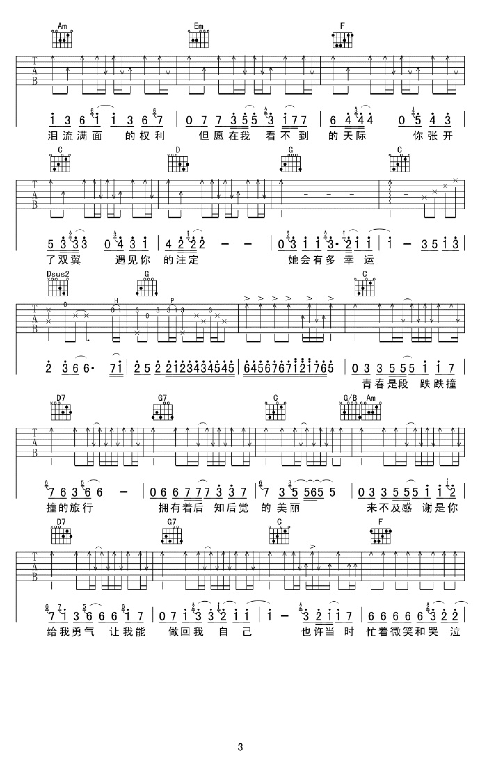 曲谱介绍: 田馥甄《小幸运》吉他弹唱谱,采用C调指法编配原版,共有4张高清图谱。