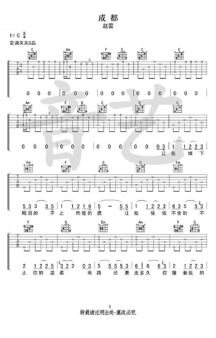 曲谱介绍: 赵雷《成都》吉他弹唱谱,采用C调指法编配原版,共有5张高清图谱。