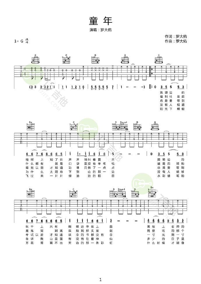 曲谱介绍: 罗大佑《童年》吉他弹唱谱,采用G调指法编配,共有2张高清图谱,免翻页排版设计。