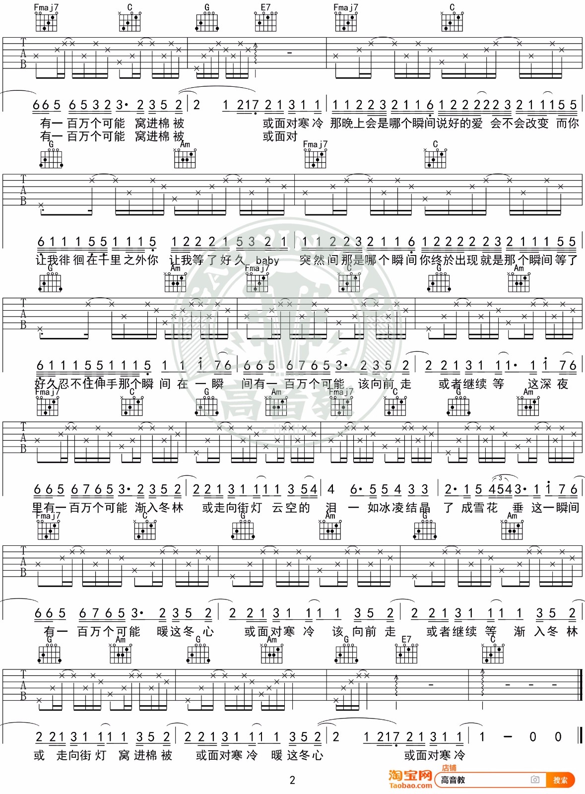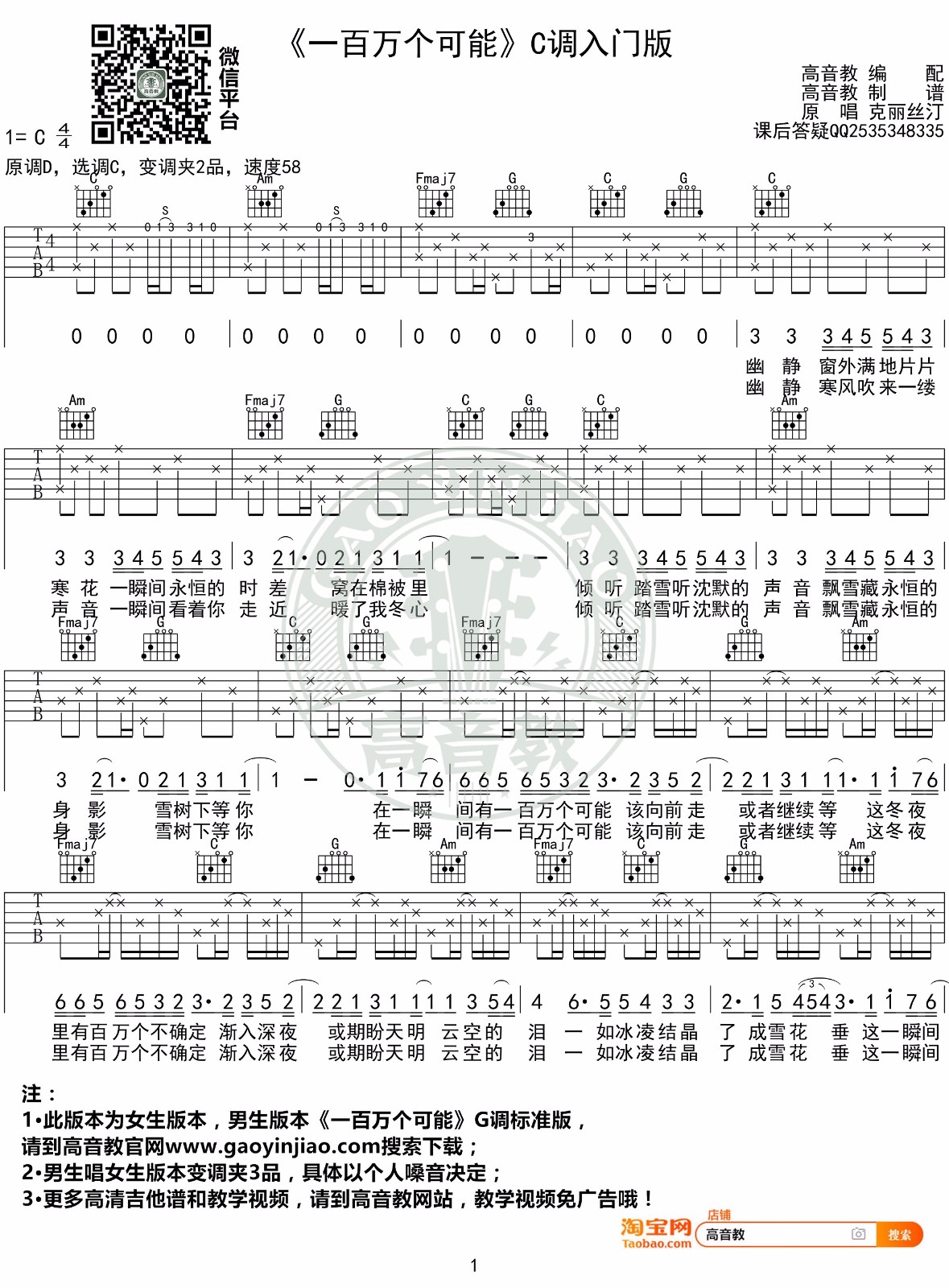 曲谱介绍: 高音教吉他弹唱教学《一百万个可能》吉他弹唱谱,采用C调指法编配,共有2张高清图谱,免翻页排版设计。