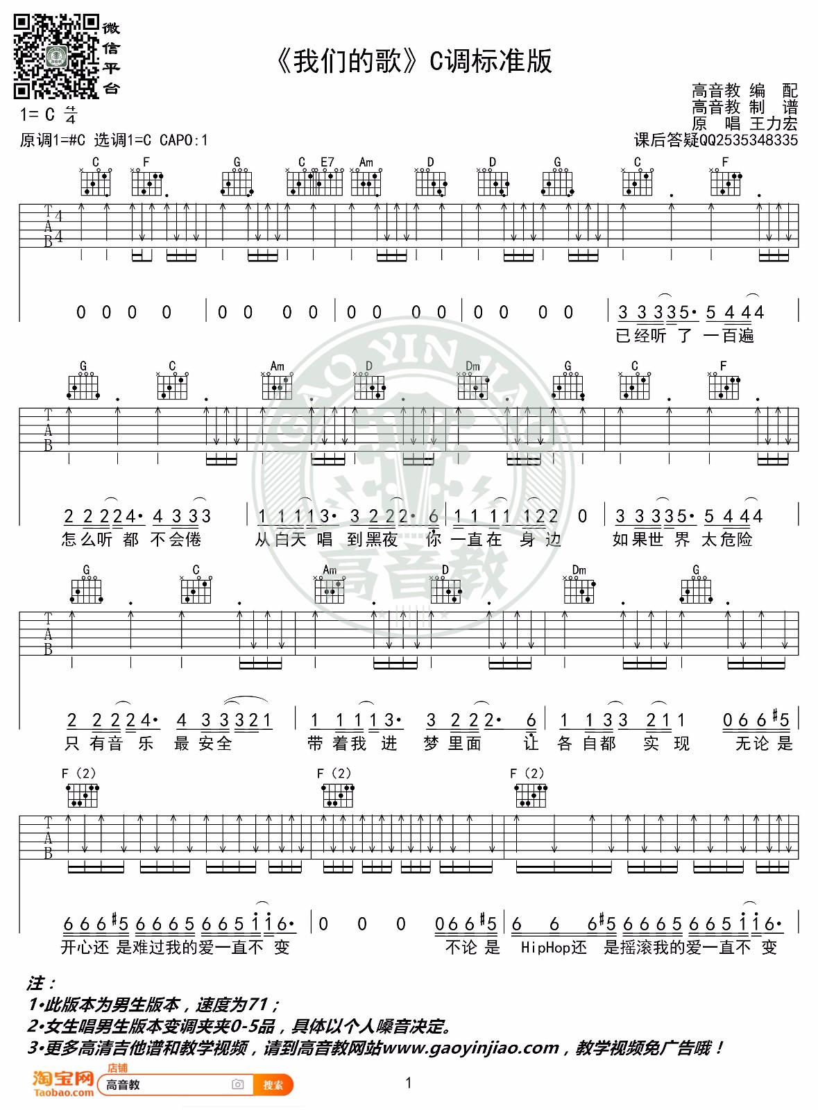曲谱介绍: 王力宏《我们的歌》吉他弹唱谱,采用C调指法编配原版,共有2张高清图谱,免翻页排版设计。