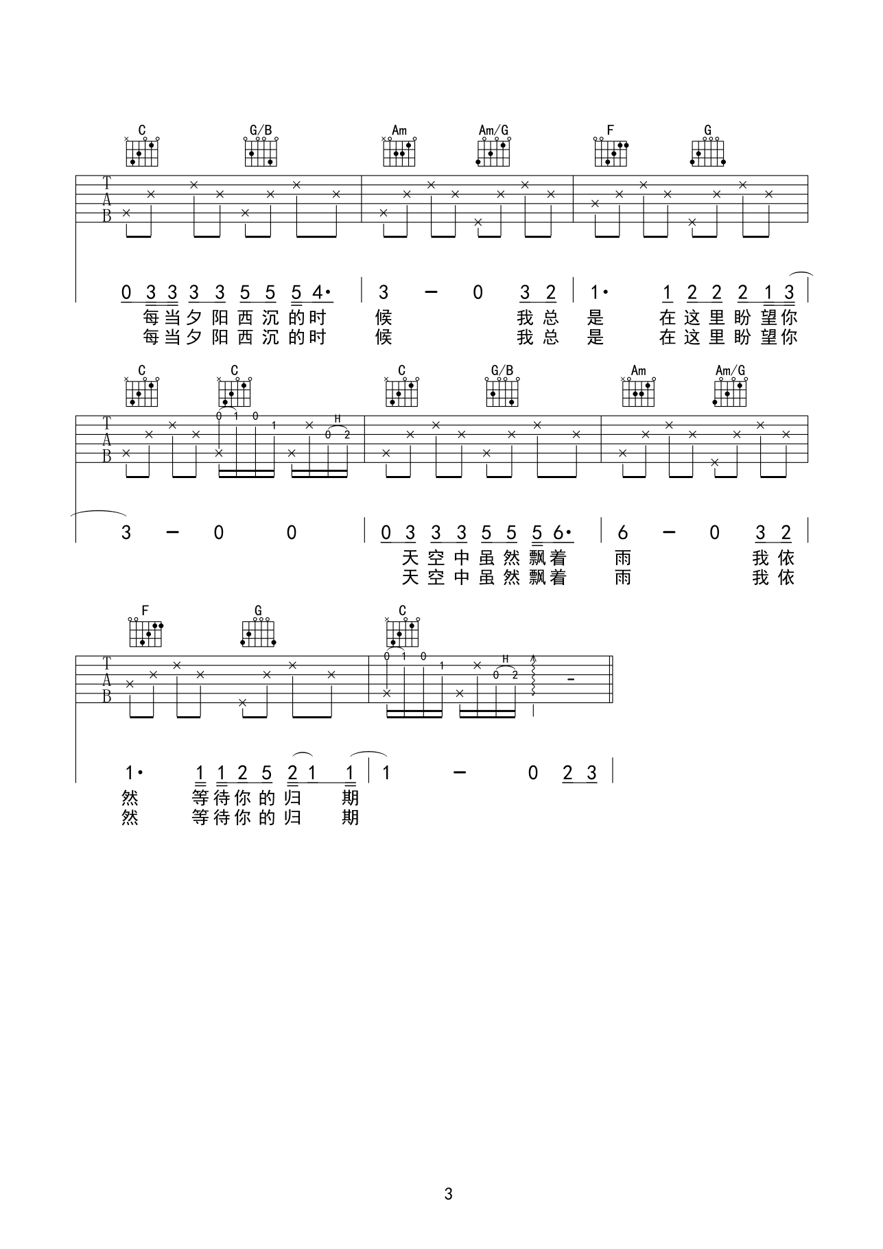 曲谱介绍: 齐秦《外面的世界》吉他弹唱谱,采用C调指法编配,共有3张高清图谱。