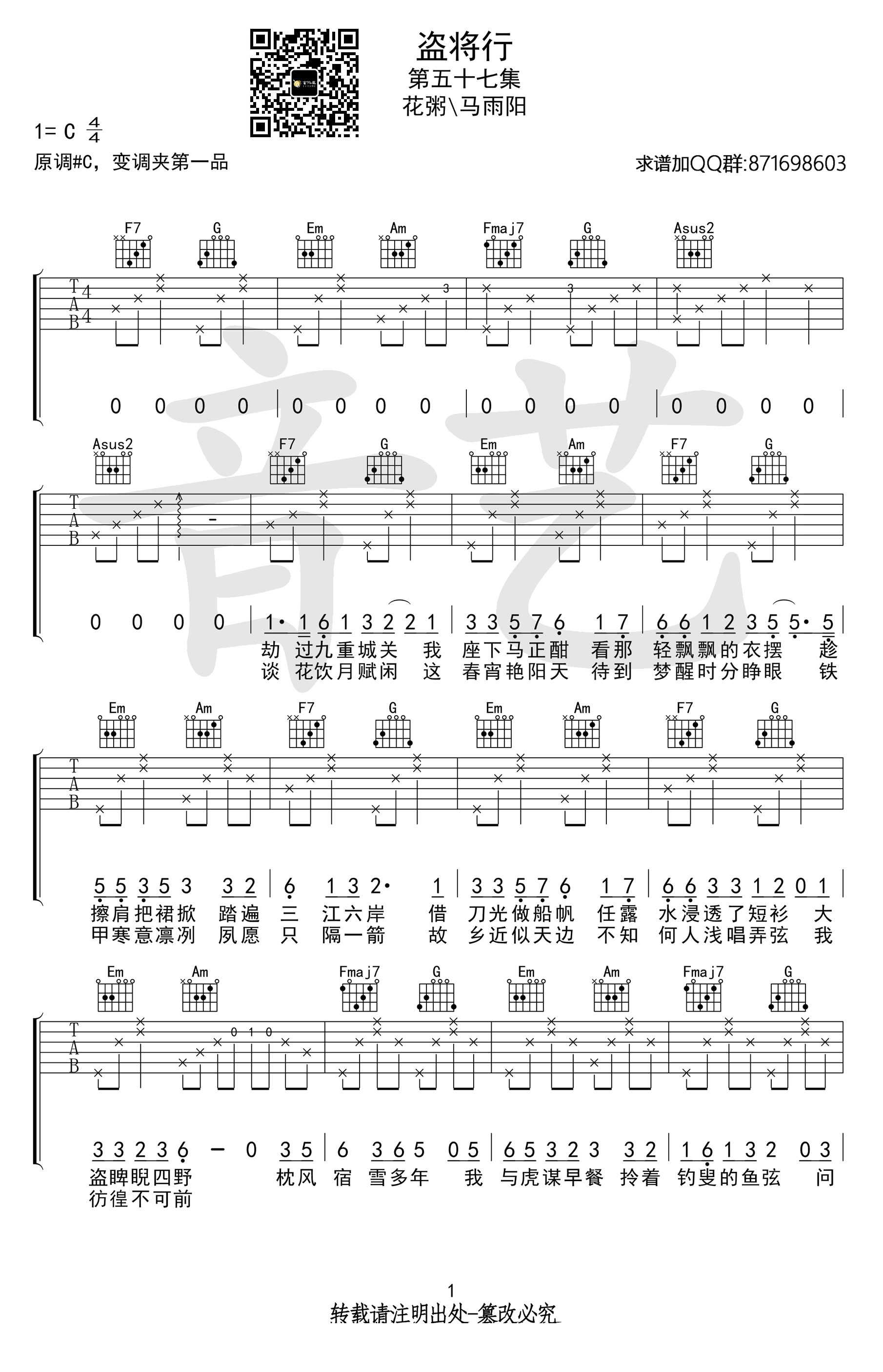曲谱介绍: 花粥《盗将行》吉他弹唱谱,采用C调指法编配,共有3张高清图谱。