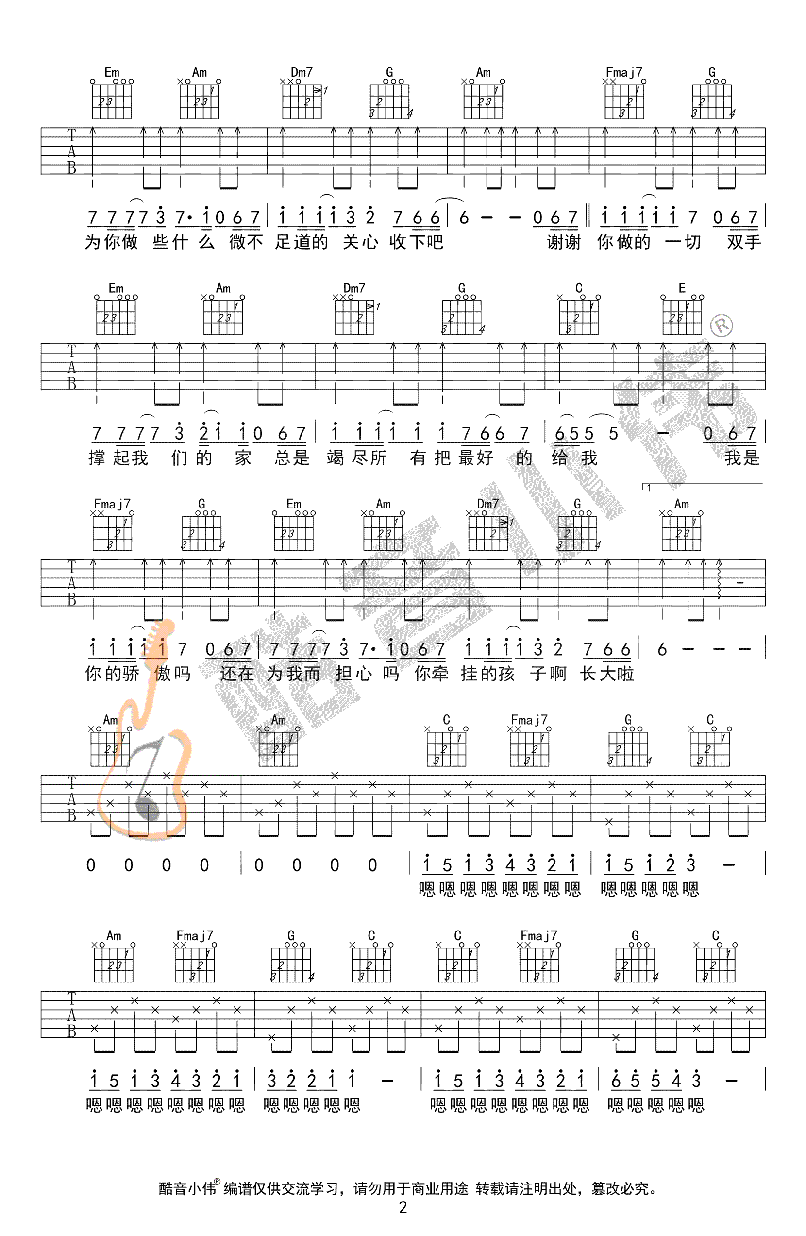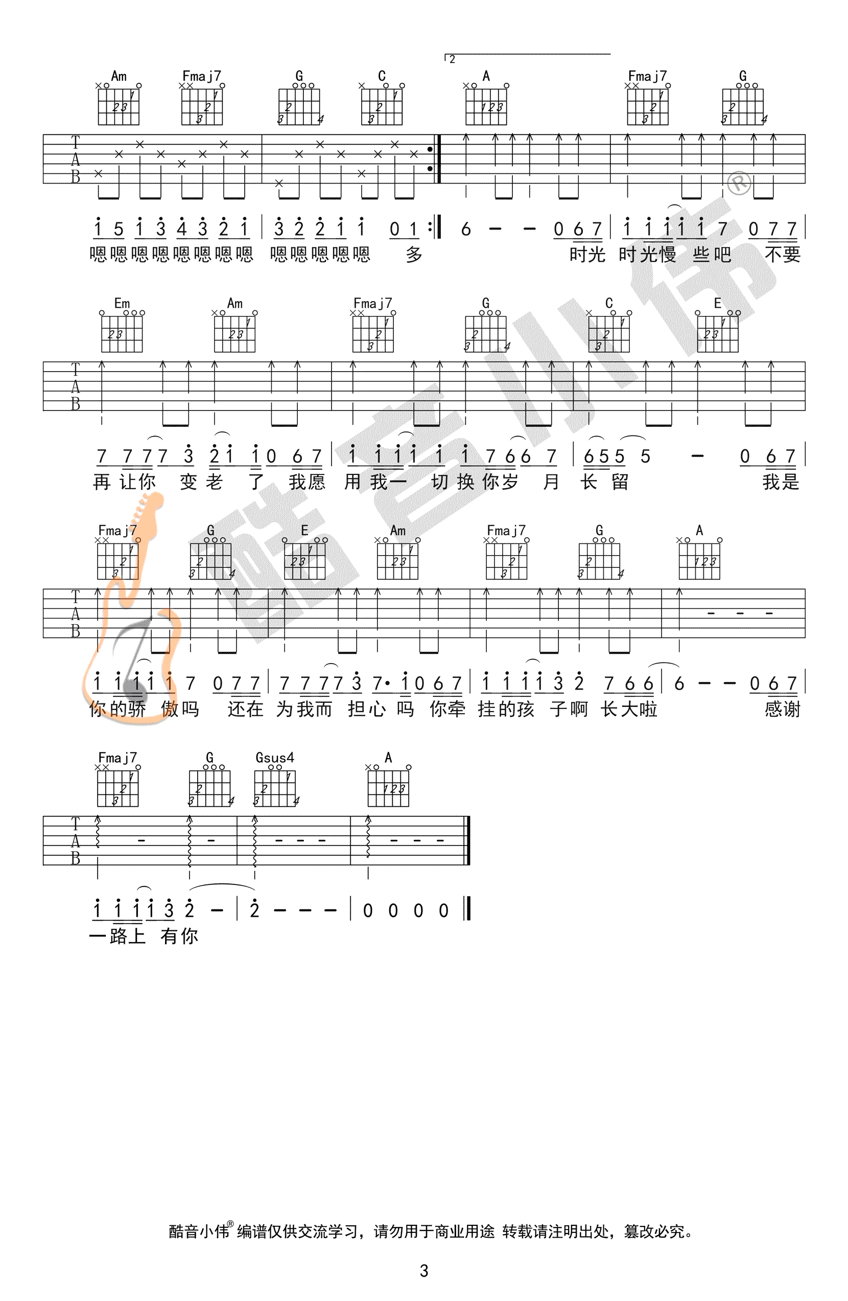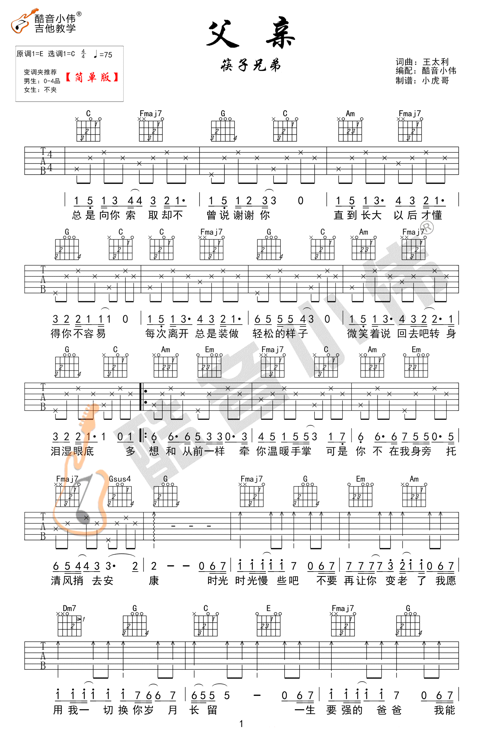 曲谱介绍: 筷子兄弟《父亲》吉他弹唱谱,采用C调指法编配,共有3张高清图谱。