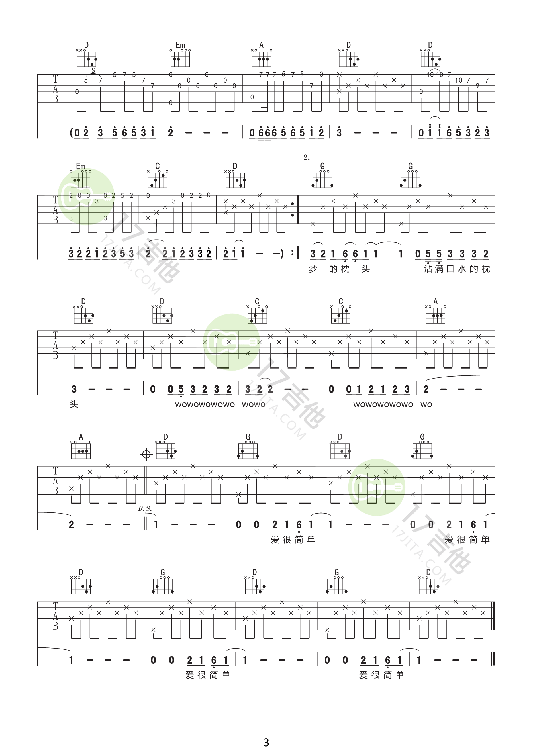 曲谱介绍: 赵雷《少年锦时》吉他弹唱谱,采用D调指法编配原版,共有3张高清图谱。