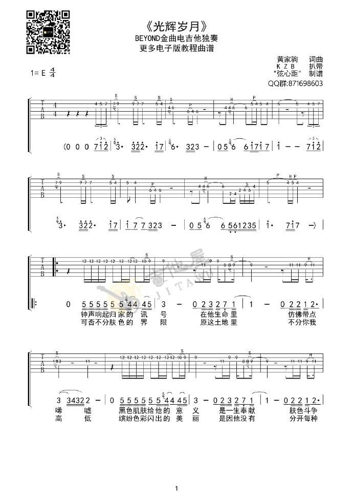 曲谱介绍: Beyond《光辉岁月》吉他独奏谱,采用E调指法编配,共有2张高清图谱,免翻页排版设计。