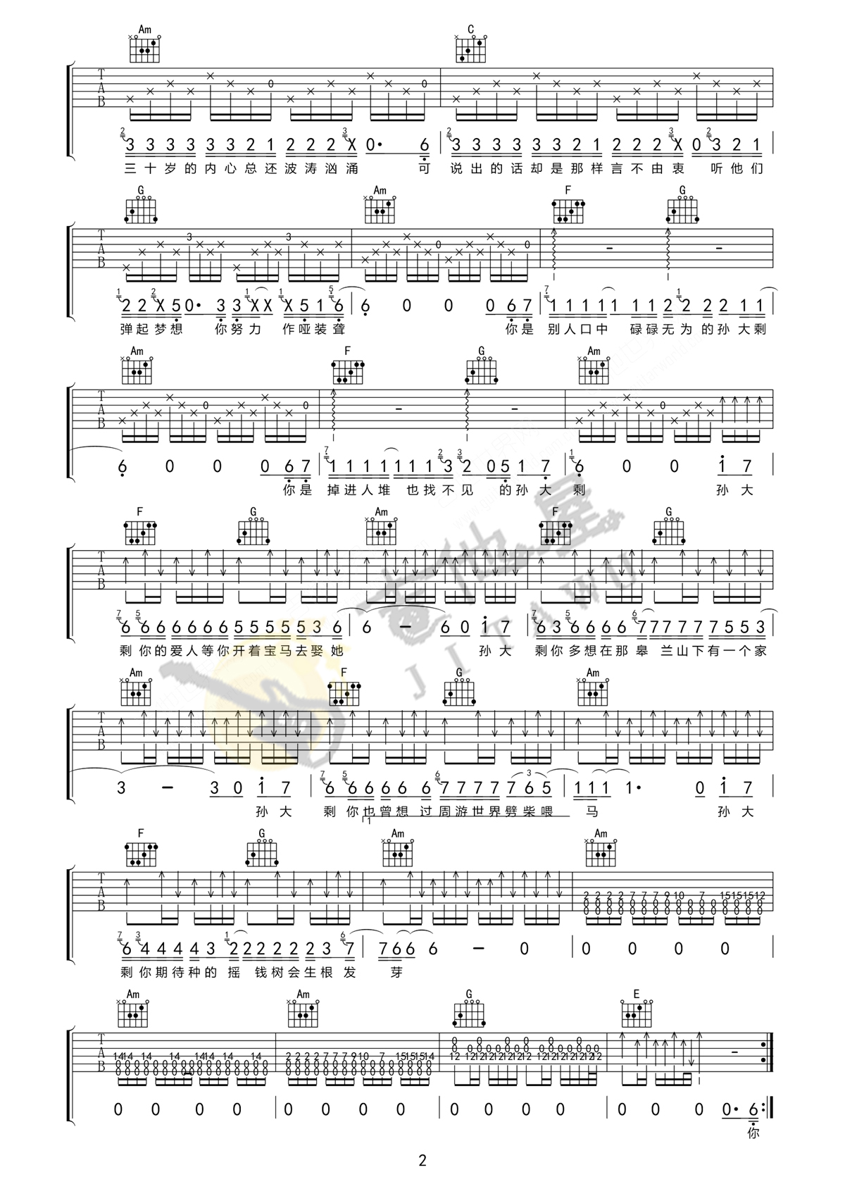 曲谱介绍: 白亮《孙大剩》吉他弹唱谱,采用C调指法编配原版,共有3张高清图谱。