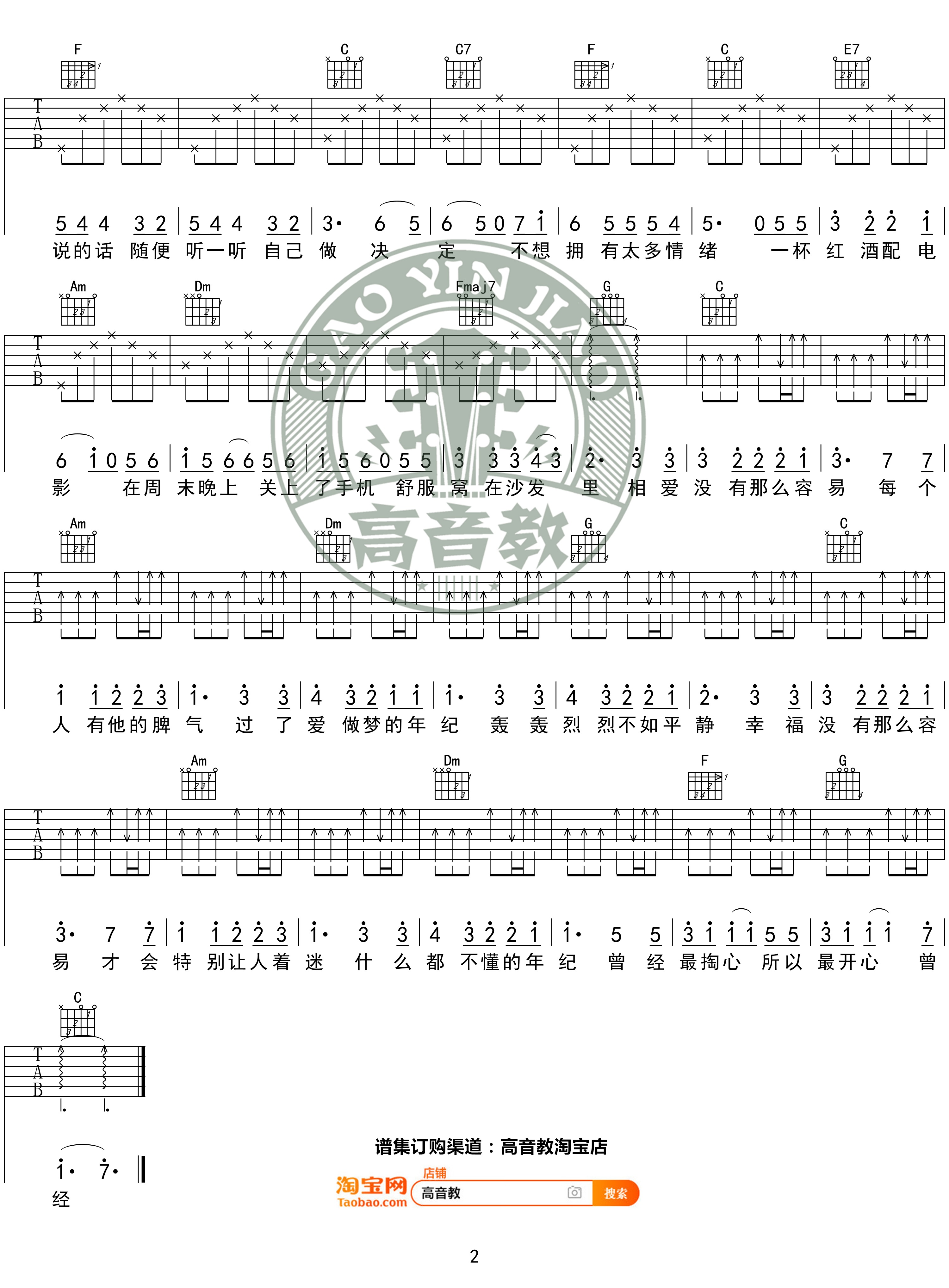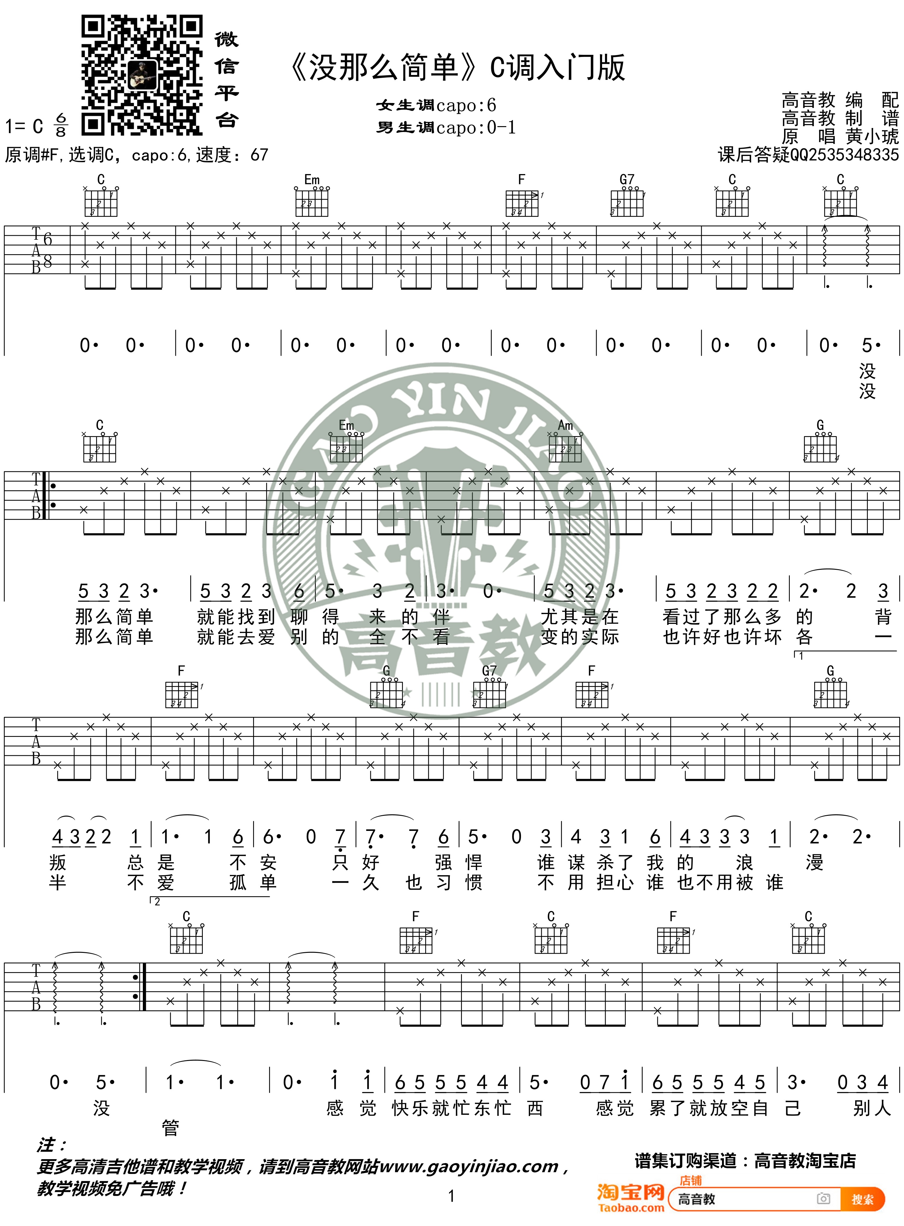 曲谱介绍: 黄小琥《没那么简单》吉他弹唱谱,采用C调指法编配,共有2张高清图谱,免翻页排版设计。